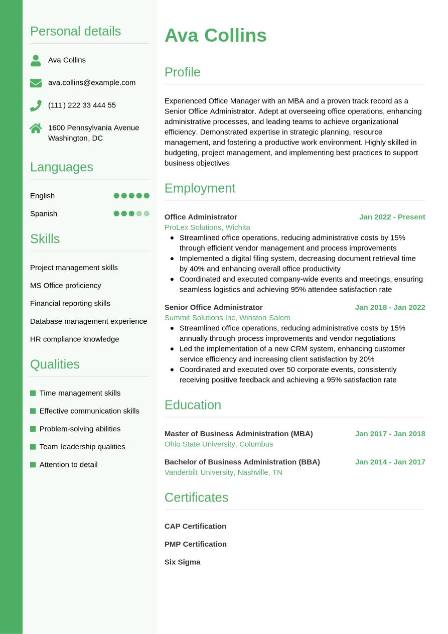 The office manager resume example below includes all the sections above, so you can see how a completed resume looks: