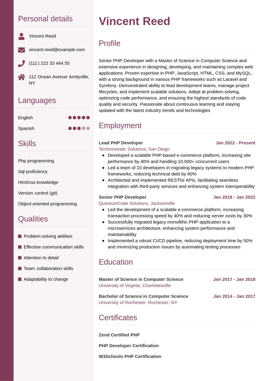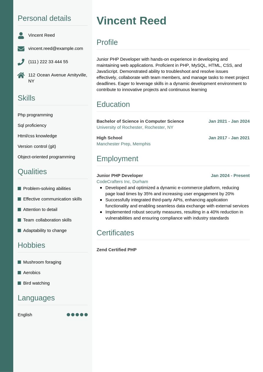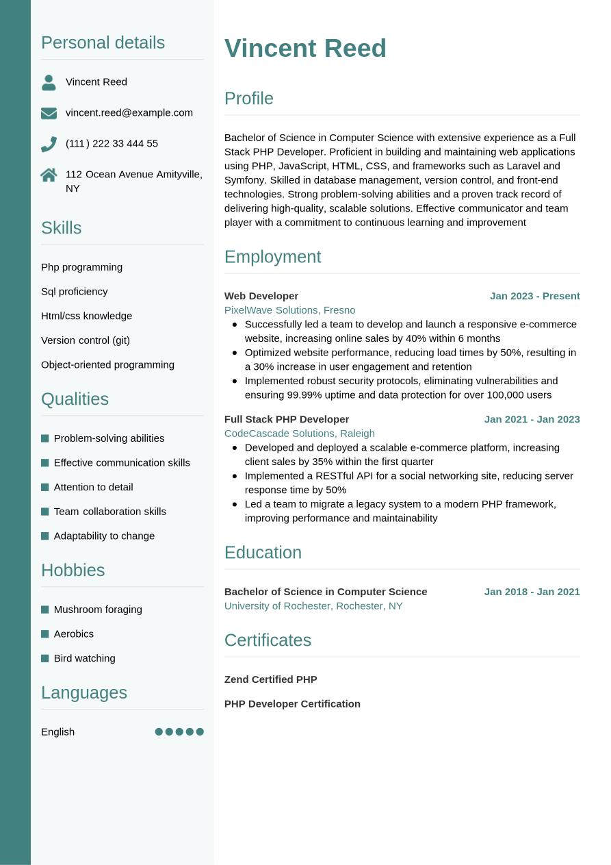 PHP Developer Resume Example