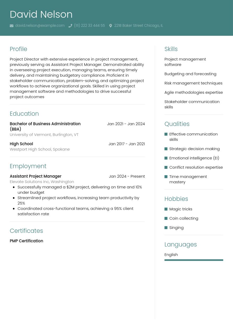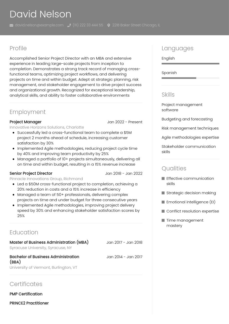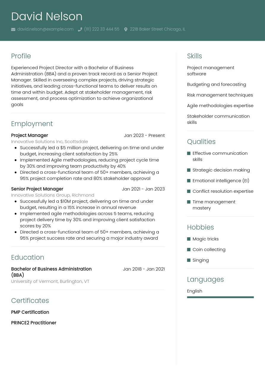 The project director resume example below incorporates all the information from above into a full-designed resume template, so you can see how a final resume will look: