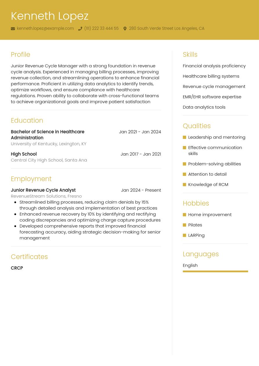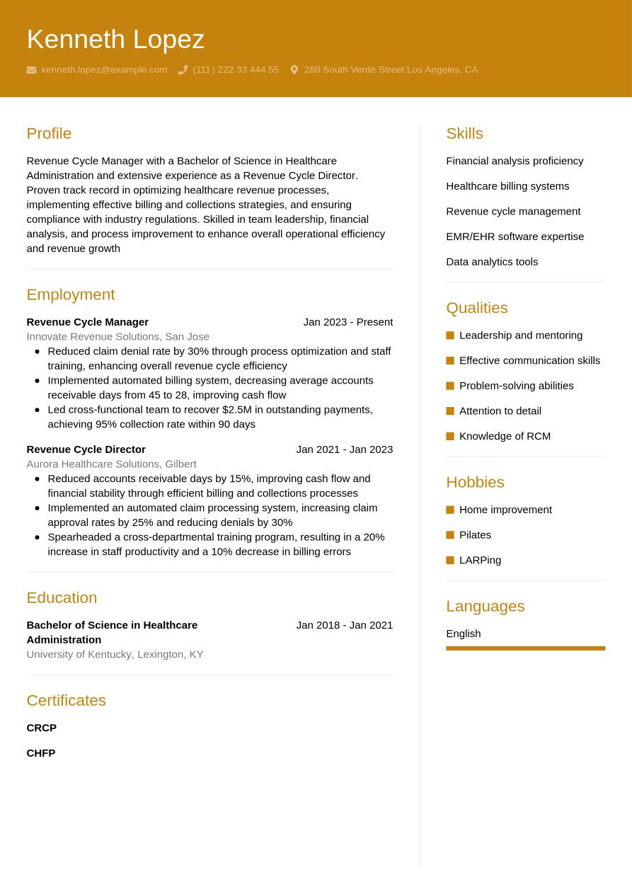 Although the content of a revenue cycle manager resume may differ according to your experience and seniority, the main sections will remain the same.