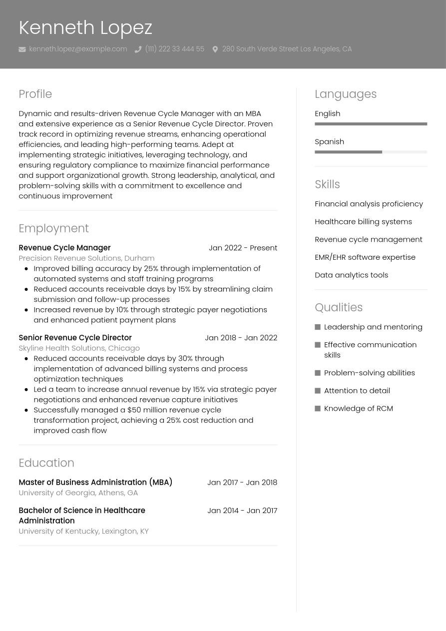 Now we've covered the main sections to include in your revenue cycle manager resume, let's take a look at how it all comes together in the example below: