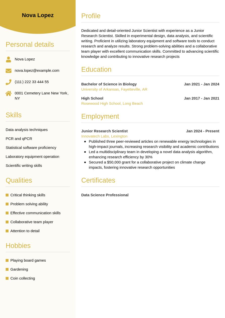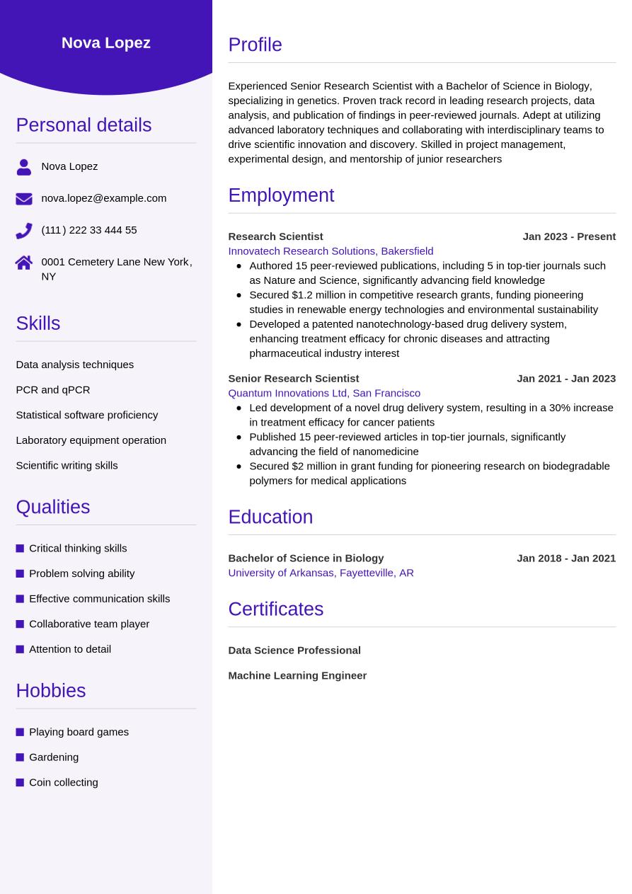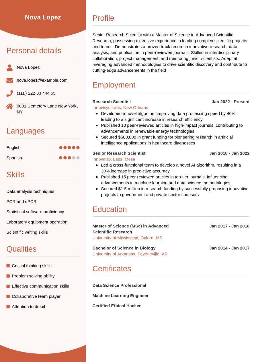 The scientist resume example below incorporates all the information from above into a full-designed resume template, so you can see how a final resume will look: