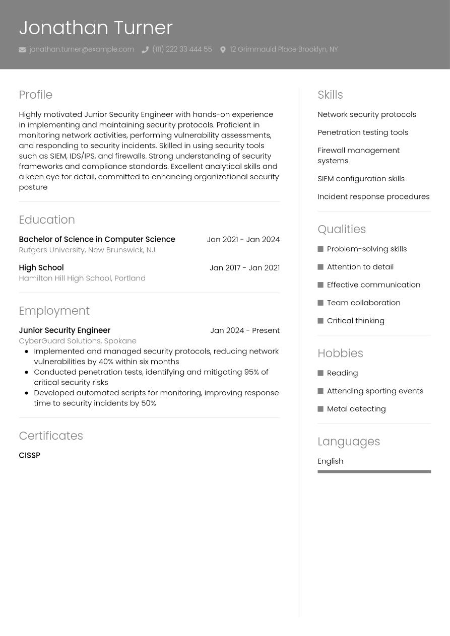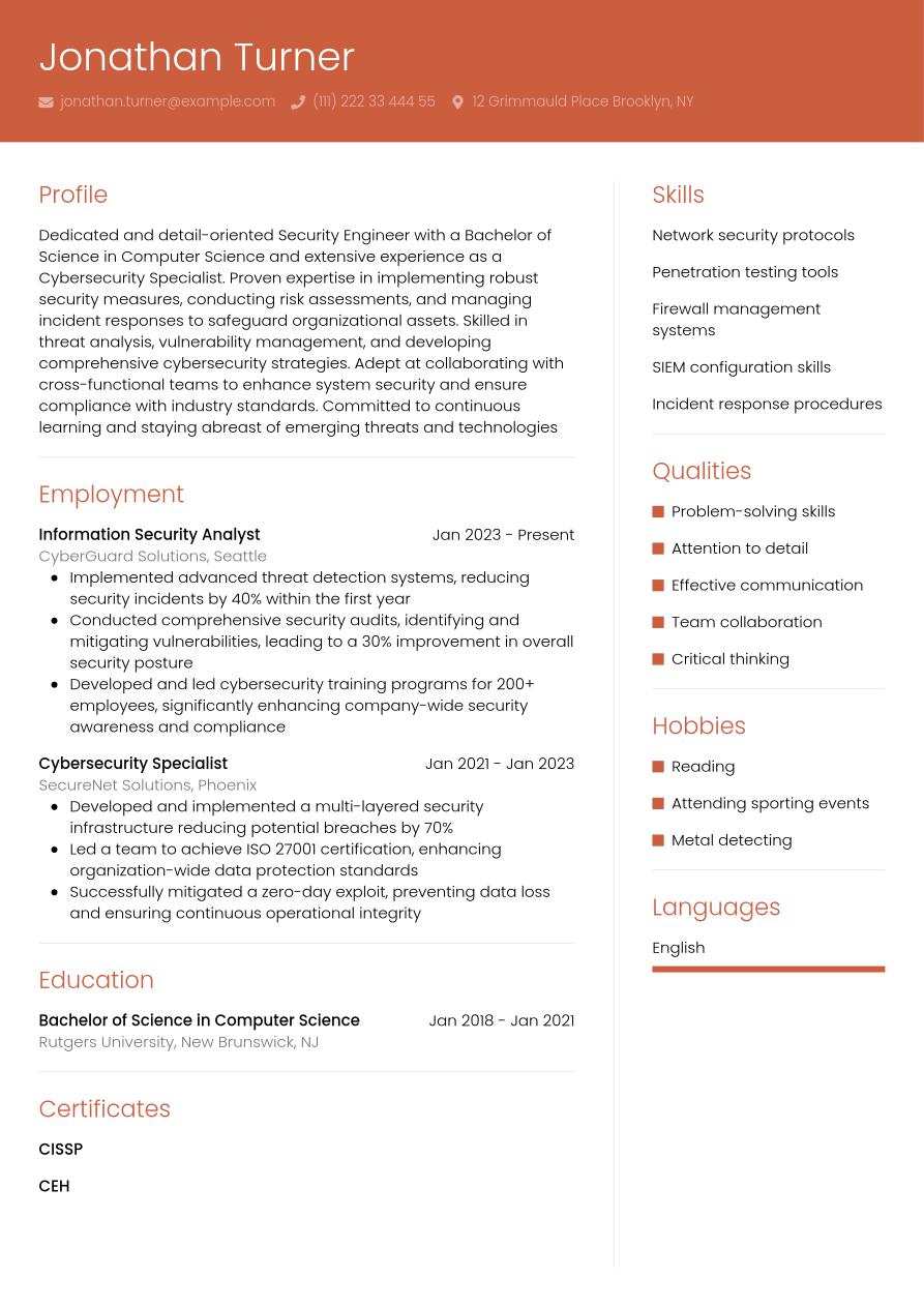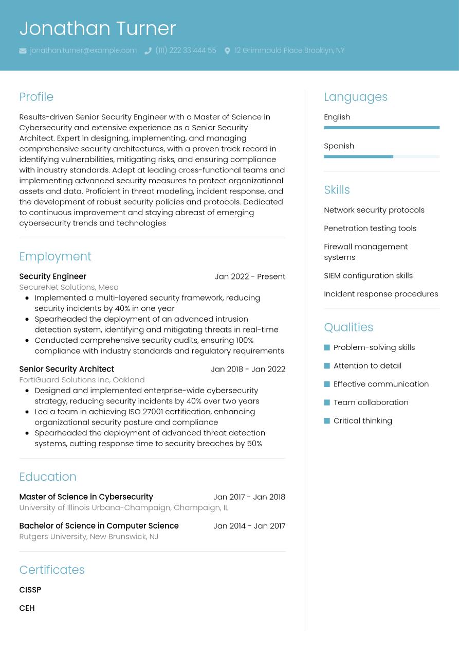Now that you know everything that needs to go into your security engineer resume, let's review an example resume that you can use as a guide when creating your own: