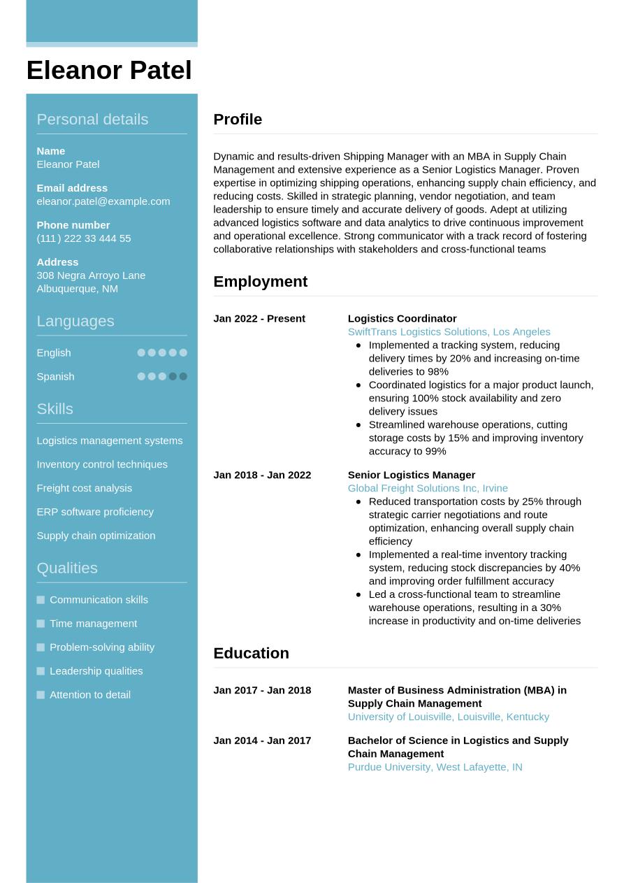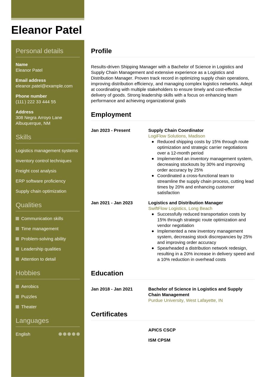 The shipping manager resume example below includes all the sections above, so you can see how a completed resume looks: