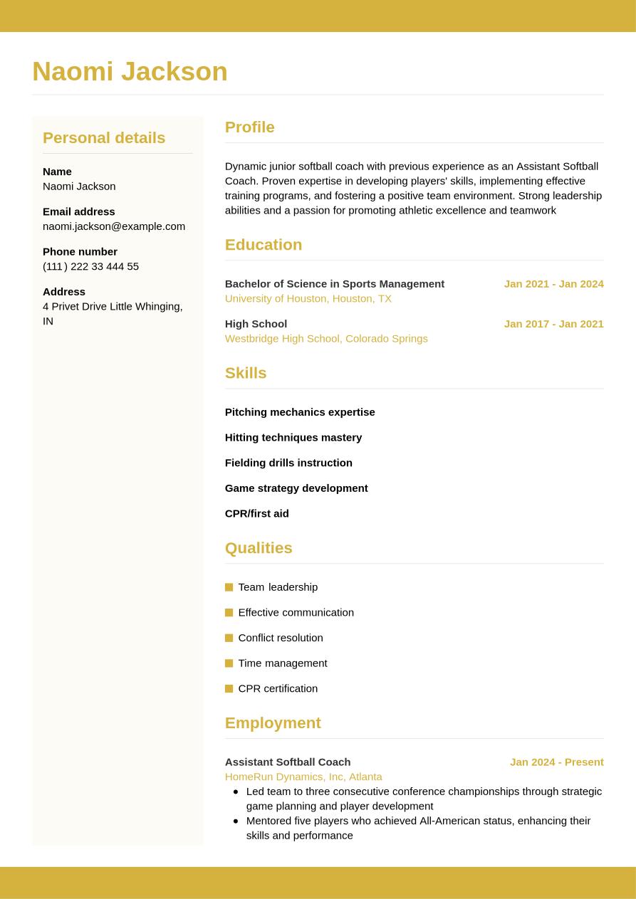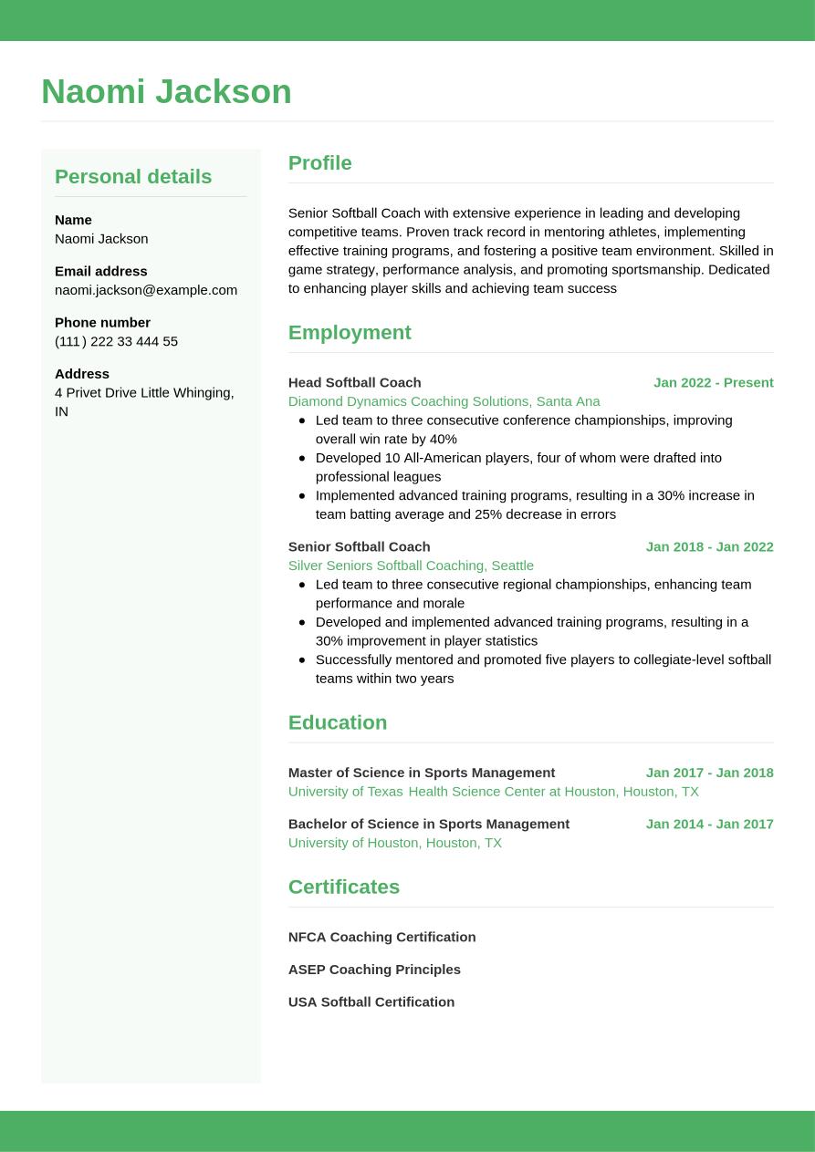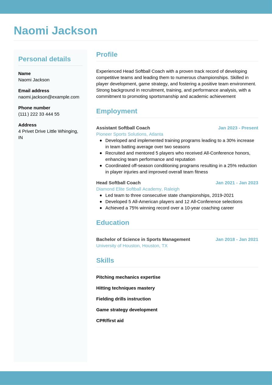Now we've covered the main sections to include in your softball coach resume, let's take a look at how it all comes together in the example below:
