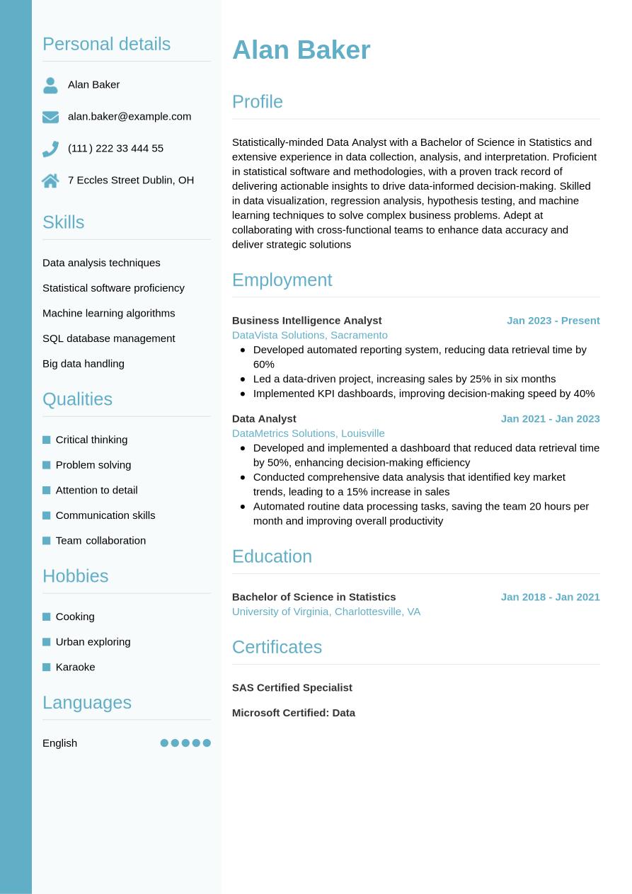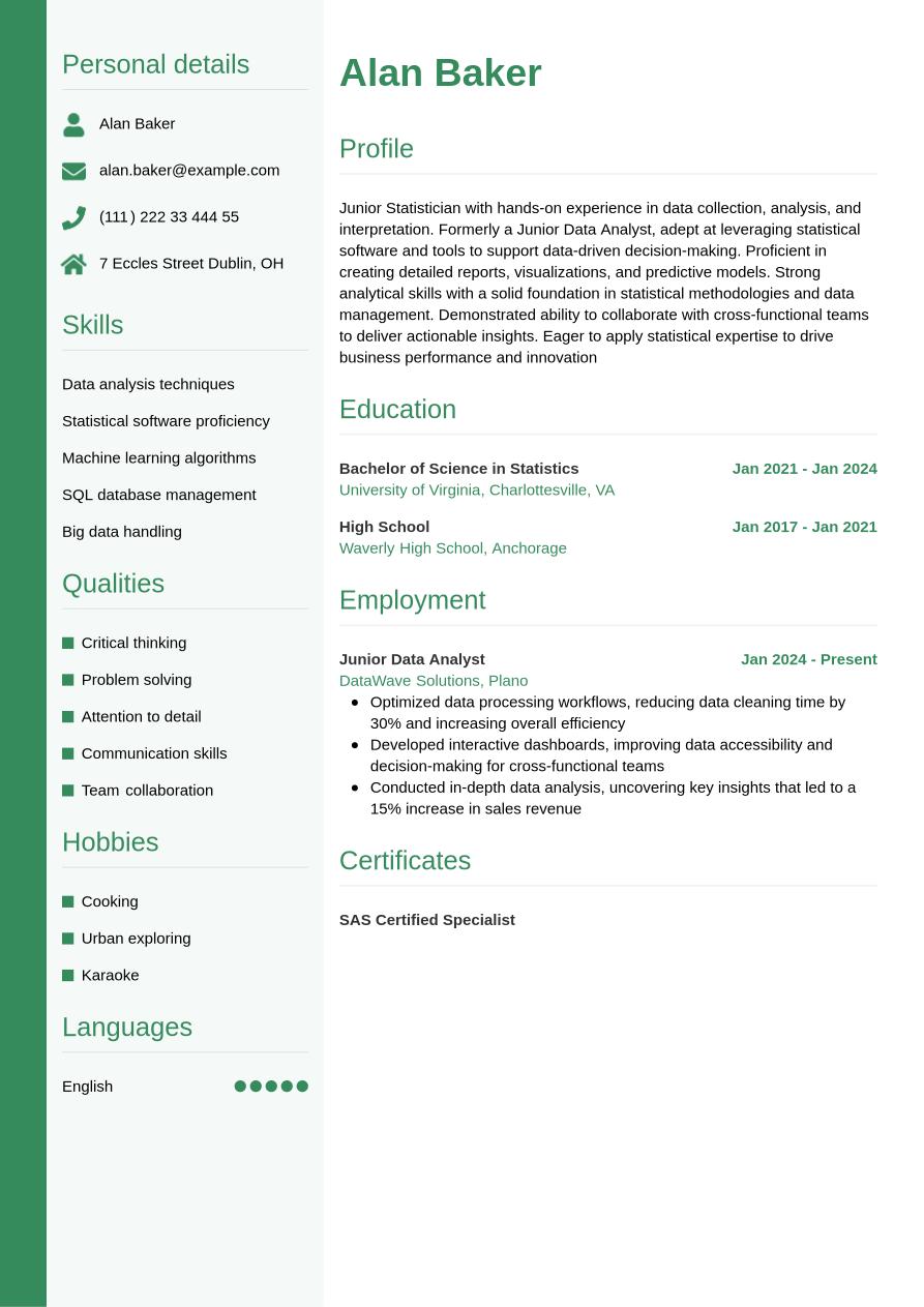 If you have no work experience as a statistician or have just started in the industry, you could consider using a functional or skills-based format, which emphasizes your skills and education. Furthermore, a junior resume is more likely to focus on soft and transferable skills, as well as relevant training, internships and volunteer roles.