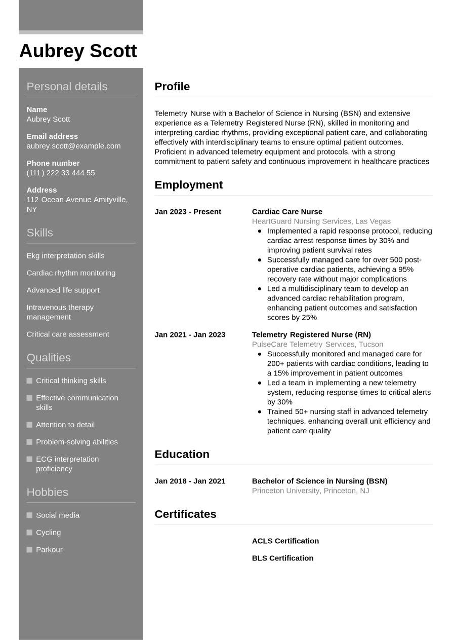 Pursuing a career as a telemetry nurse provides opportunities for career progression and responsibilities involving assessing patient vitals and monitoring ECG readings. A professional resume for telemetry nurse applications will showcase your relevant skills and career achievements, to help you stand out from the crowd. In this article, we'll outline how to write a winning resume to boost your chances of success in your telemetry nurse applications.