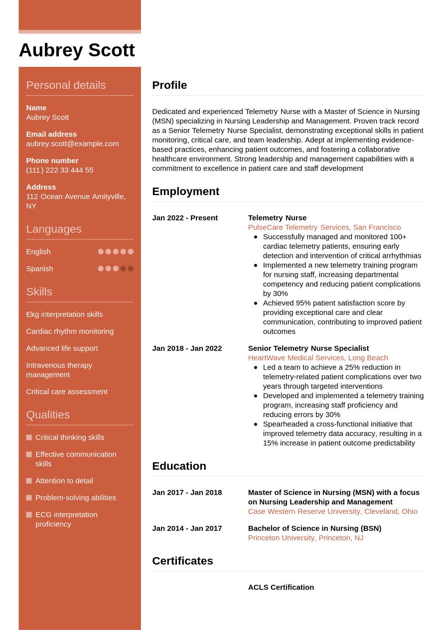 Now we've covered the main sections to include in your telemetry nurse resume, let's take a look at how it all comes together in the example below: