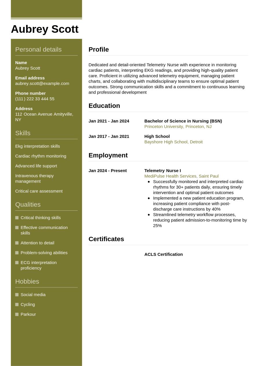 A strong resume summary focuses on two or three key skills and achievements that showcase your suitability for telemetry nurse roles in a clear, quantifiable way. It also gives an insight into your personal qualities, to help the reader understand why you're a suitable candidate. See below for some great examples of what to include in your telemetry nurse resume summary.
