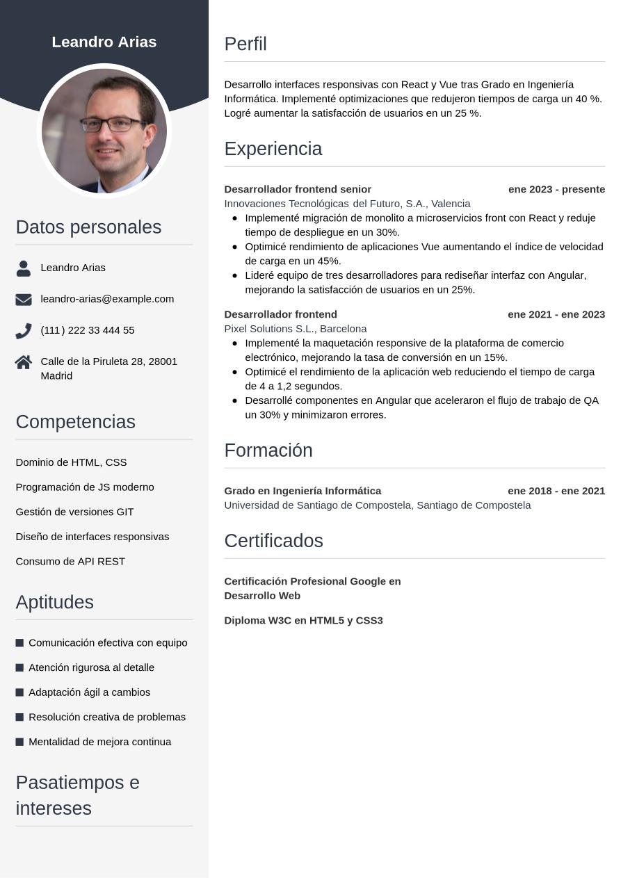Acumular años no es suficiente para ser considerado un frontend developer sénior, sino que es importante demostrar éxito en implementaciones, renovaciones u optimizaciones de procesos y metodologías, así como un fuerte dominio de habilidades modernas y demandadas. Organizar y diseñar un currículum de frontend developer de dos páginas para reflejar toda la evolución profesional en la última década es posible si sabes en qué centrarte. Prioriza en tu educación los títulos o las certificaciones esenciales para desempeñar tu cargo y reserva para el apartado de "Cursos" otras formaciones de vanguardia. En la experiencia, relaciona tus tareas con los resultados alcanzados y utiliza verbos de acción para darles una impronta más fuerte.