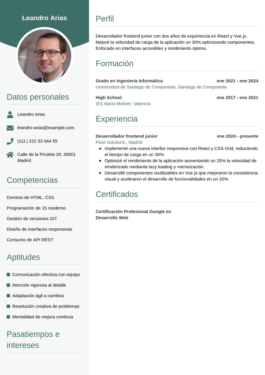 El perfil, también conocido como la sección "sobre mí", tiene la función de presentar de manera convincente al comienzo del CV las principales habilidades, logros y experiencias que te hacen un profesional idóneo para el puesto de frontend developer. Según el nivel de experiencia y las circunstancias, este pequeño párrafo puede estar más enfocado en el pasado (experiencias y habilidades) o en el futuro (metas y proyectos), es decir, puede variar entre un perfil o un objetivo profesional. Combinar ambos matices puede resultar muy persuasivo para apoyarte en logros y experiencias anteriores, y explicar hacia dónde te diriges laboralmente.