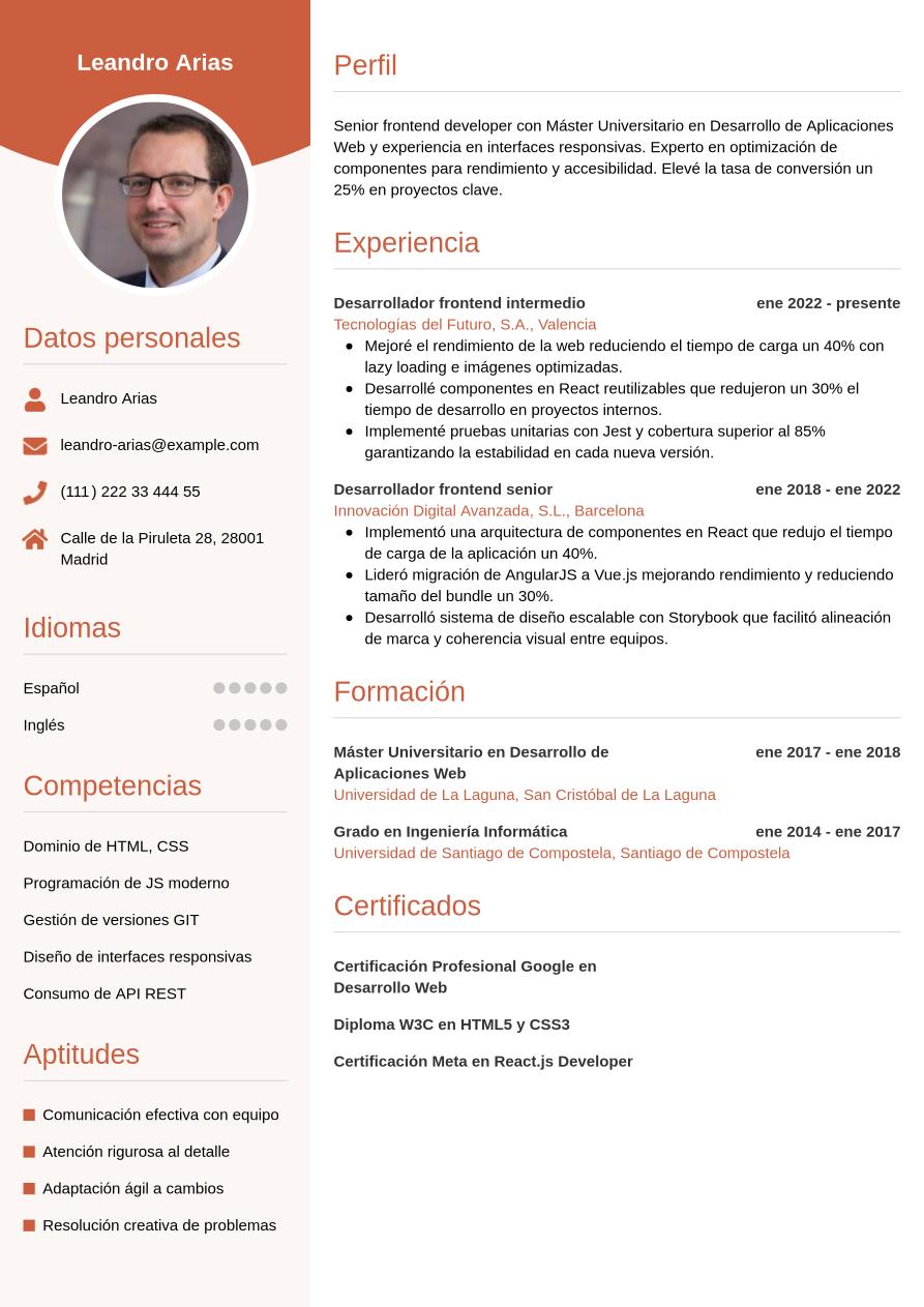 Ahora que ya sabes cómo ordenar y completar las secciones de tu currículum de frontend developer, presta atención al siguiente ejemplo organizado y de buen gusto estético. El siguiente modelo de CV de frontend developer proyecta profesionalismo y responde a las exigencias actuales de los reclutadores.