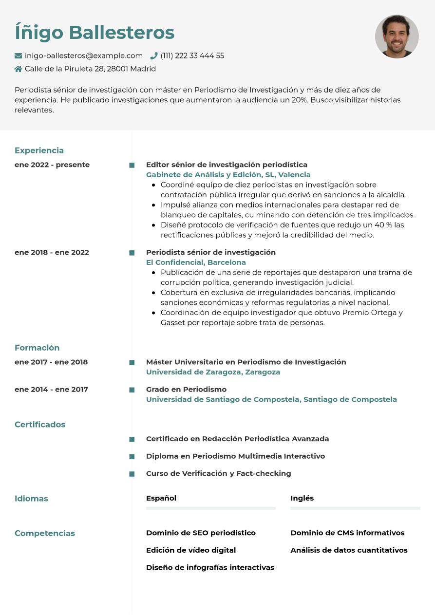 Dar el próximo paso profesional y aspirar a un cargo de periodista avanzado implica sintetizar tus últimos cinco a diez años de experiencia. Para no perder impacto ni valor, sino resaltar lo relevante para la oferta laboral, es fundamental poner en relieve las habilidades que te califican para desempeñar tareas complejas, pero también para gestionar y liderar equipos. Organizar y diseñar un currículum de periodista de dos páginas para reflejar toda la evolución profesional en la última década es posible si sabes en qué centrarte. Prioriza en tu educación los títulos o las certificaciones esenciales para desempeñar tu cargo y reserva para el apartado de "Cursos" otras formaciones de vanguardia. En la experiencia, relaciona tus tareas con los resultados alcanzados y utiliza verbos de acción para darles una impronta más fuerte.