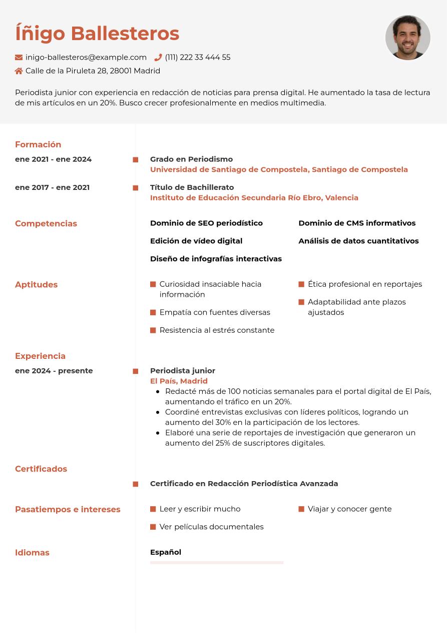 La educación tiene más peso en un CV de estudiante o de periodista junior, cuya experiencia laboral es nula o escasa y, por tanto, se coloca primero. Cuando llega el momento de escribir la sección de experiencia de tu CV de periodista, ante la ausencia de empleos asalariados se ponen antecedentes en voluntariados, proyectos personales e iniciativas extracurriculares. En la sección de habilidades, un periodista principiante tiene que hacer hincapié en sus competencias personales y técnicas, sobre todo las transferibles que quizás aprendió en un contexto extralaboral, pero son beneficiosas para el rol solicitado. Agregar pasatiempos e intereses también puede mostrar un perfil compatible con el puesto de periodista o la empresa.