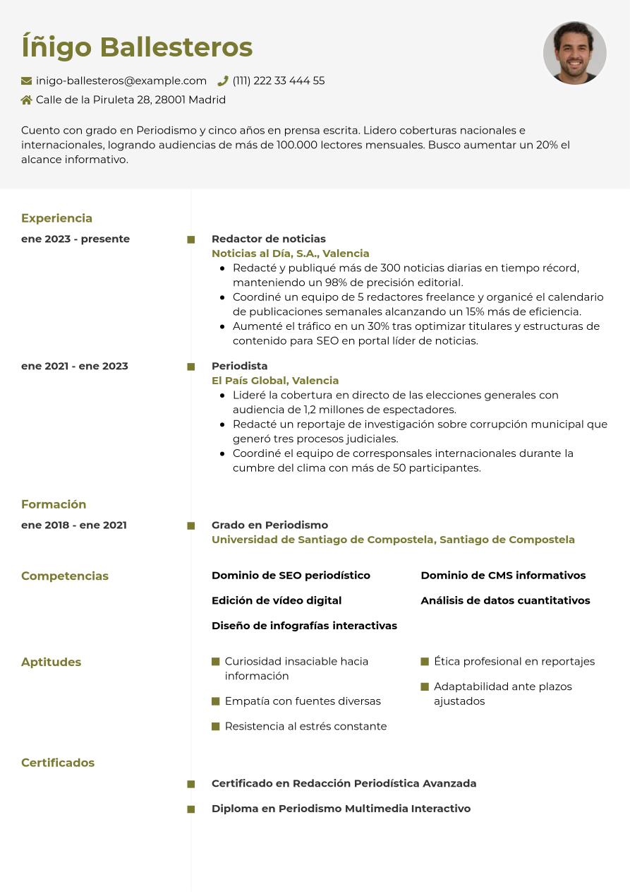 La carrera profesional de un periodista abarca investigar información de actualidad, elaborar artículos para prensa y/o verificar fiabilidad de fuentes. Al solicitar un empleo para cubrir un puesto de periodista, tu CV debe demostrar tus habilidades de curiosidad insaciable hacia información, ética profesional en reportajes y empatía con fuentes diversas, así como dominio de SEO periodístico y dominio de CMS informativos. A lo largo de este artículo encontrarás consejos y ejemplos para hacer un currículum de periodista atractivo y efectivo que capte la atención del responsable de contratación y te consiga tu próximo empleo.