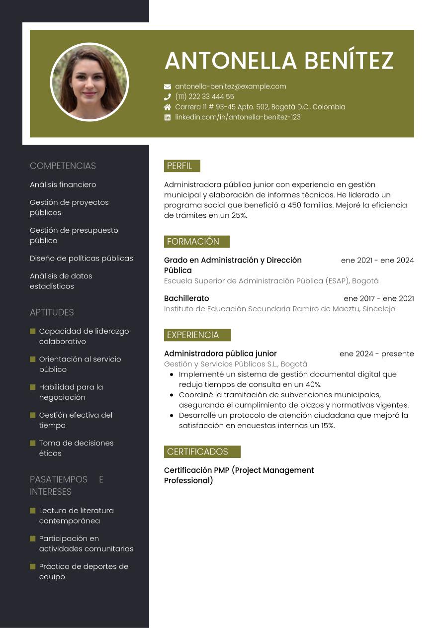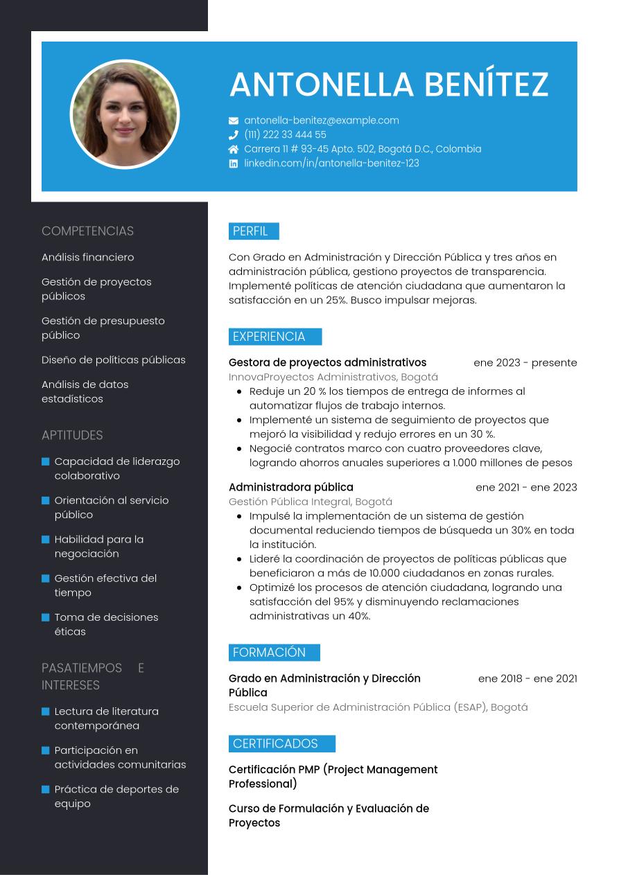 Un postulante mid-level, con tres a cinco años de carrera, necesita una hoja de vida basada en resultados concretos y un dominio autónomo de habilidades duras y blandas. Reflejar que estás en pleno crecimiento profesional es clave. Tu experiencia como administrador público debe centrarse en responsabilidades crecientes, logros numéricos y capacidad de autogestión. Al estar en una etapa intermedia de tu vida laboral, demostrar el aprendizaje continuo mediante certificaciones y cursos causa una buena impresión. Las habilidades de autonomía, pensamiento crítico y trabajo en equipo son cruciales.
