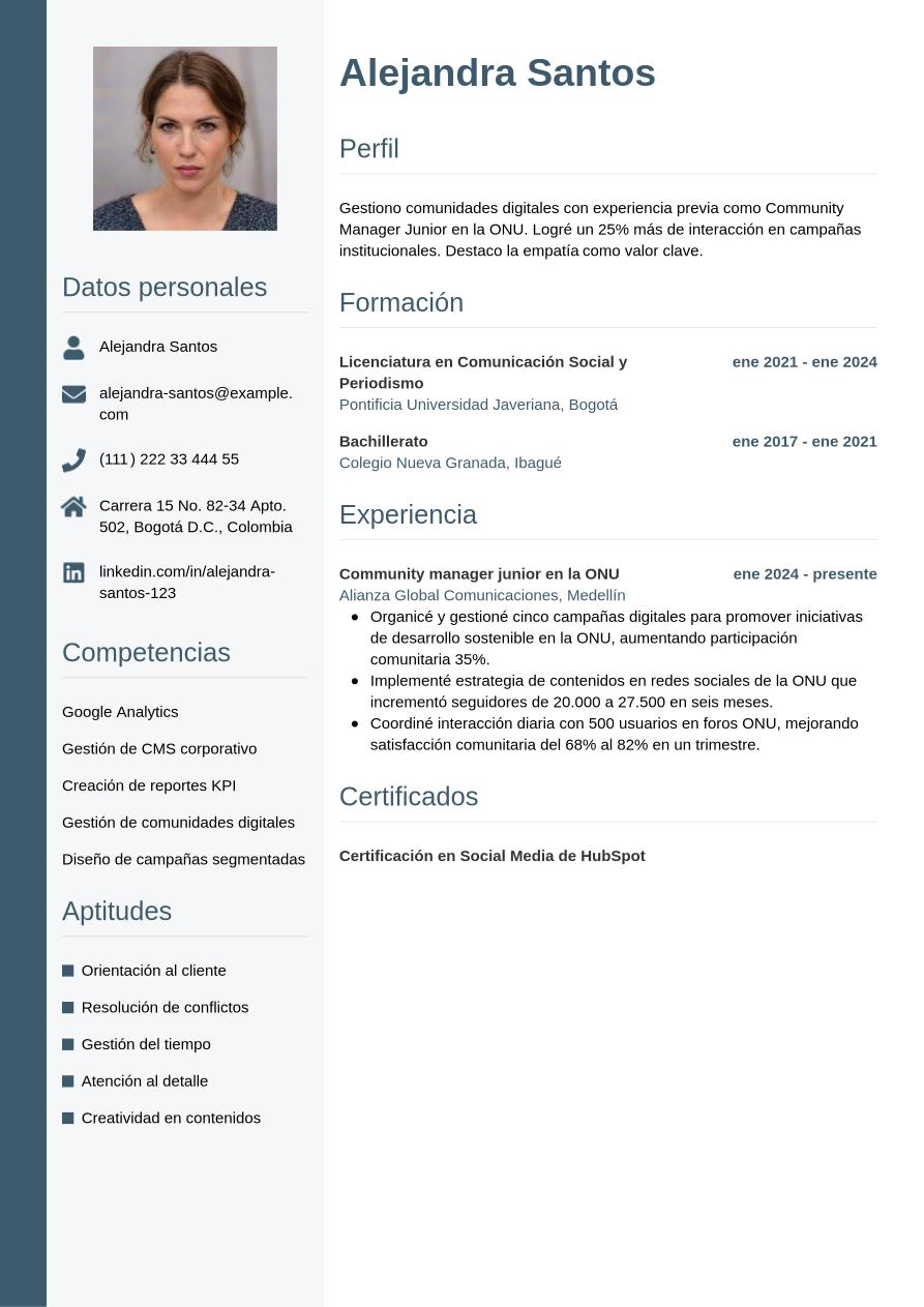 Estudiantes, graduados recientes o un community manager aspirante a su primer empleo tendrían que optar por una hoja de vida cronológica inversa porque es fácil de redactar, apta para ATS y bien recibida por reclutadores. Además, muestra tu progreso educativo y/o en actividades complementarias, como trabajos voluntarios y proyectos extracurriculares o personales.