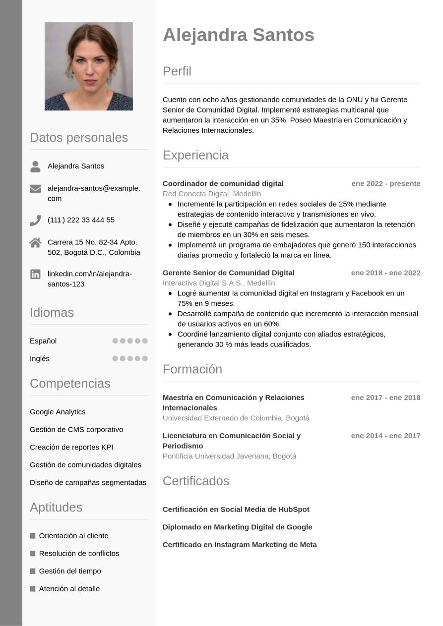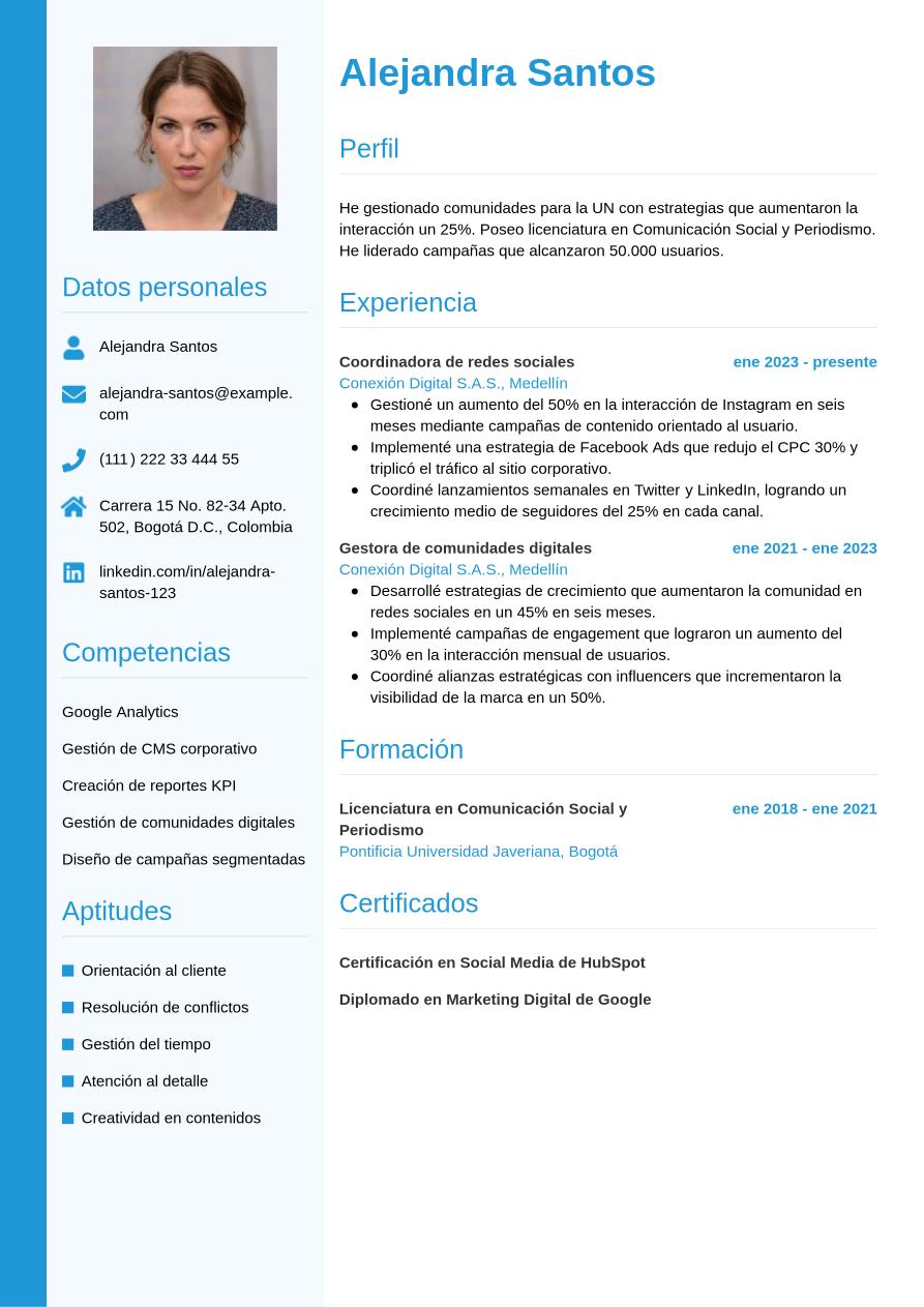 Un postulante mid-level, con tres a cinco años de carrera, necesita una hoja de vida basada en resultados concretos y un dominio autónomo de habilidades duras y blandas. Reflejar que estás en pleno crecimiento profesional es clave. Tu experiencia como community manager debe centrarse en responsabilidades crecientes, logros numéricos y capacidad de autogestión. Al estar en una etapa intermedia de tu vida laboral, demostrar el aprendizaje continuo mediante certificaciones y cursos causa una buena impresión. Las habilidades de autonomía, pensamiento crítico y trabajo en equipo son cruciales.