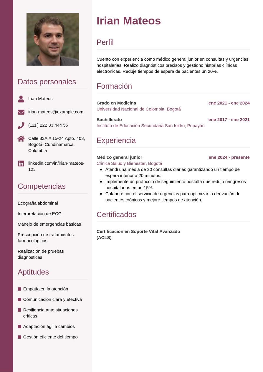La experiencia de un médico general júnior no es fuerte y se basa en actividades no laborales, como voluntariados, iniciativas extracurriculares y pasantías. Por eso, conviene presentar primero la educación en la hoja de vida, más aún si se trata de un estudiante o graduado reciente. La sección de habilidades es clave para destacar aquellas transversales al cargo de médico general.