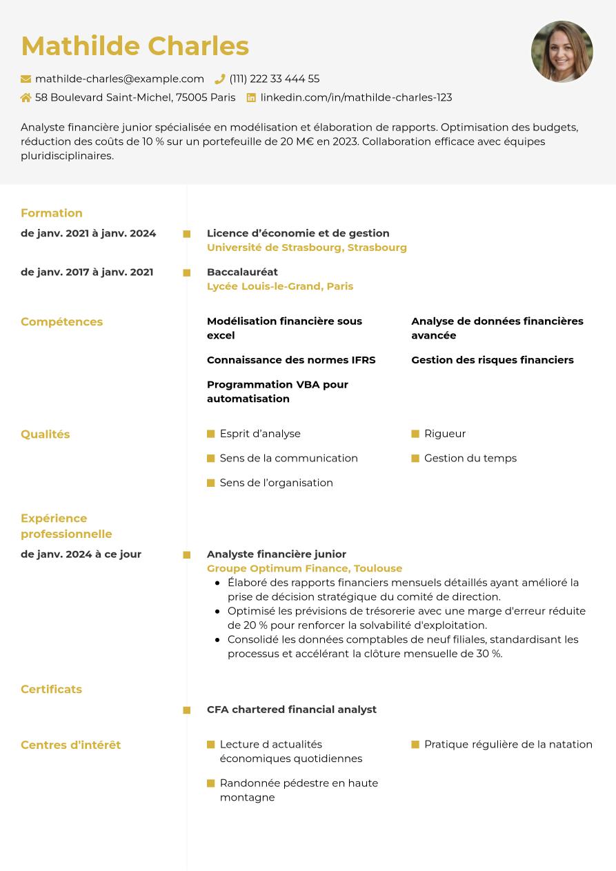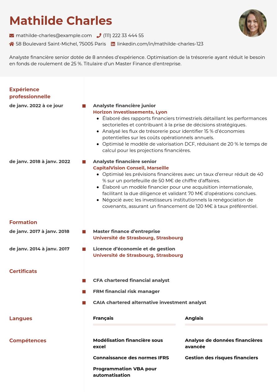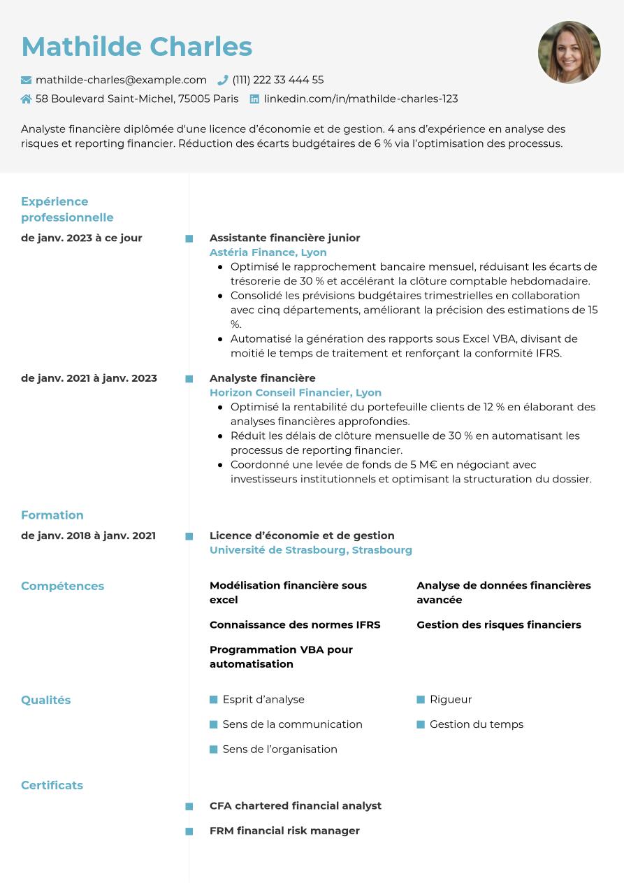 Vous savez quels éléments intégrer pour créer un CV d’analyste financier efficace, observez-en le rendu grâce au design soigné et moderne de l’exemple ci-dessous :