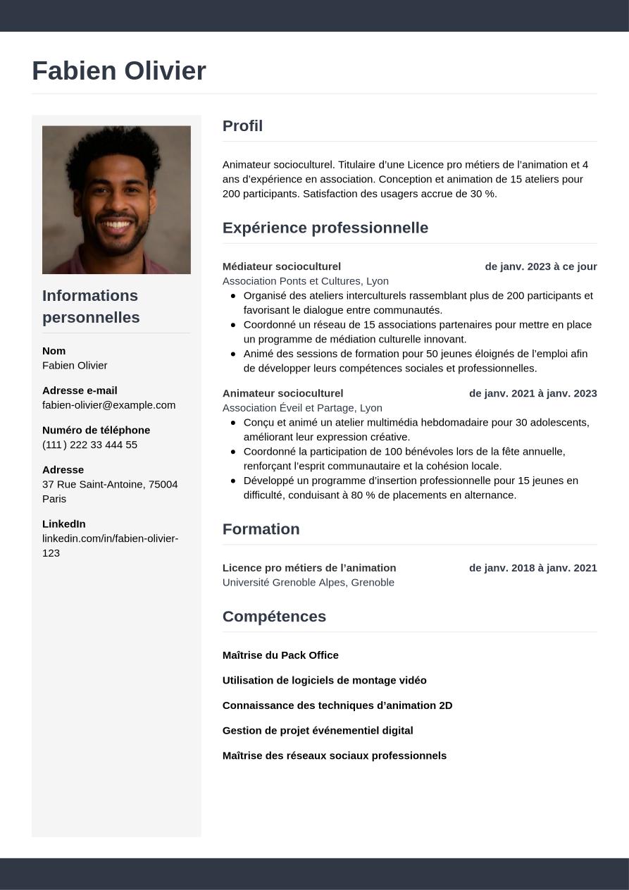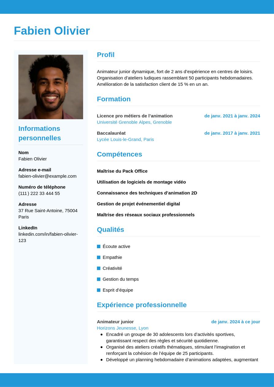 Vous savez quels éléments intégrer pour créer un CV d’animateur efficace, observez-en le rendu grâce au design soigné et moderne de l’exemple ci-dessous :