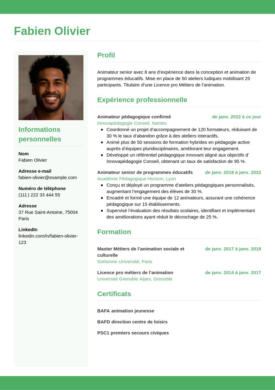 Le générateur de CV de Jobseeker vous permet de créer un CV facilement et rapidement, conforme aux attentes des recruteurs pour un animateur. Notre gamme de modèles préconçus vous assurent de présenter un document professionnel et esthétique.