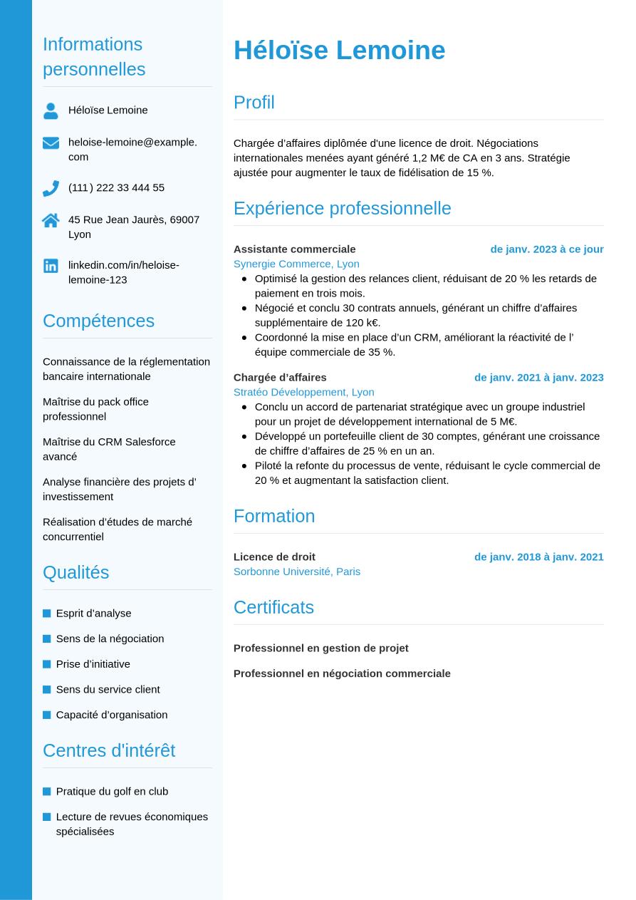 Chargée d’affaires diplômée d'une licence de droit. Négociations internationales menées ayant généré 1,2 M€ de CA en 3 ans. Stratégie ajustée pour augmenter le taux de fidélisation de 15 %.