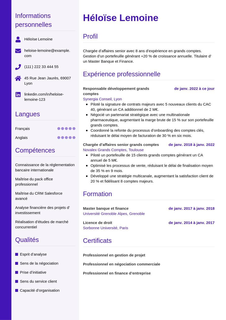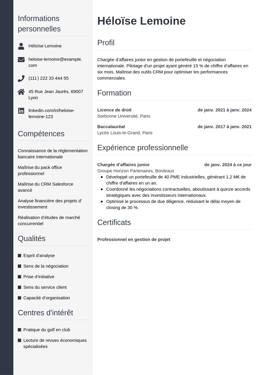 Vous savez quels éléments intégrer pour créer un CV de chargé d’affaires efficace, observez-en le rendu grâce au design soigné et moderne de l’exemple ci-dessous :