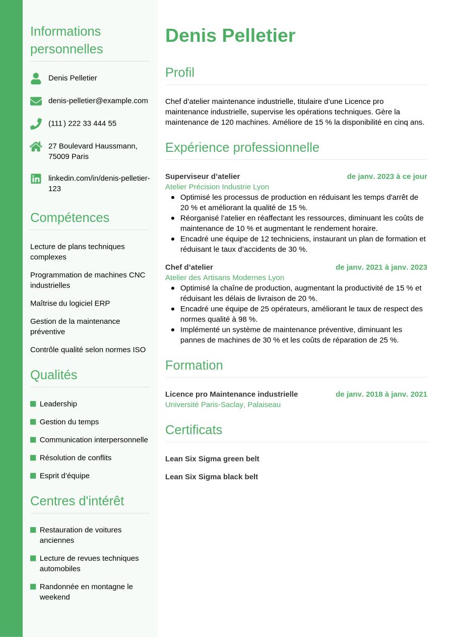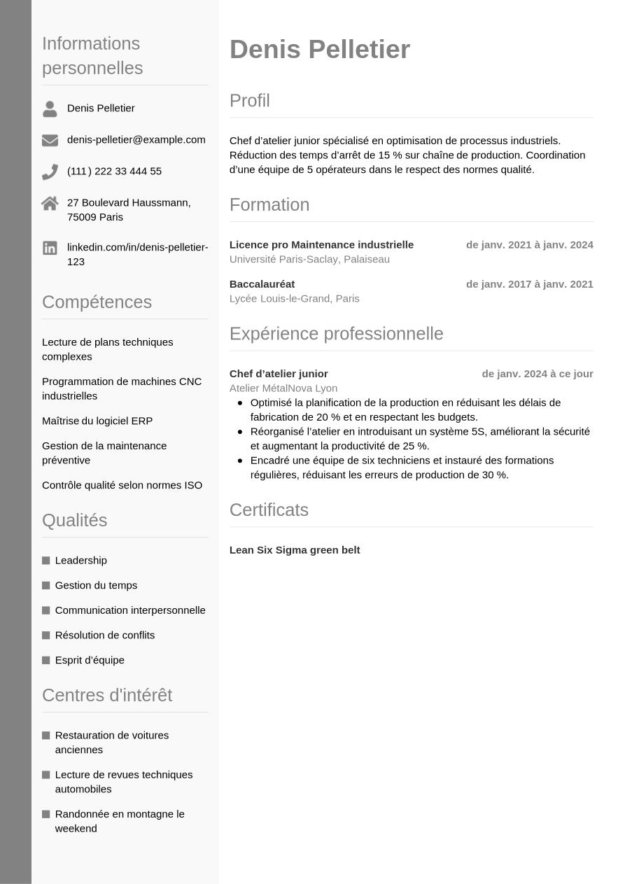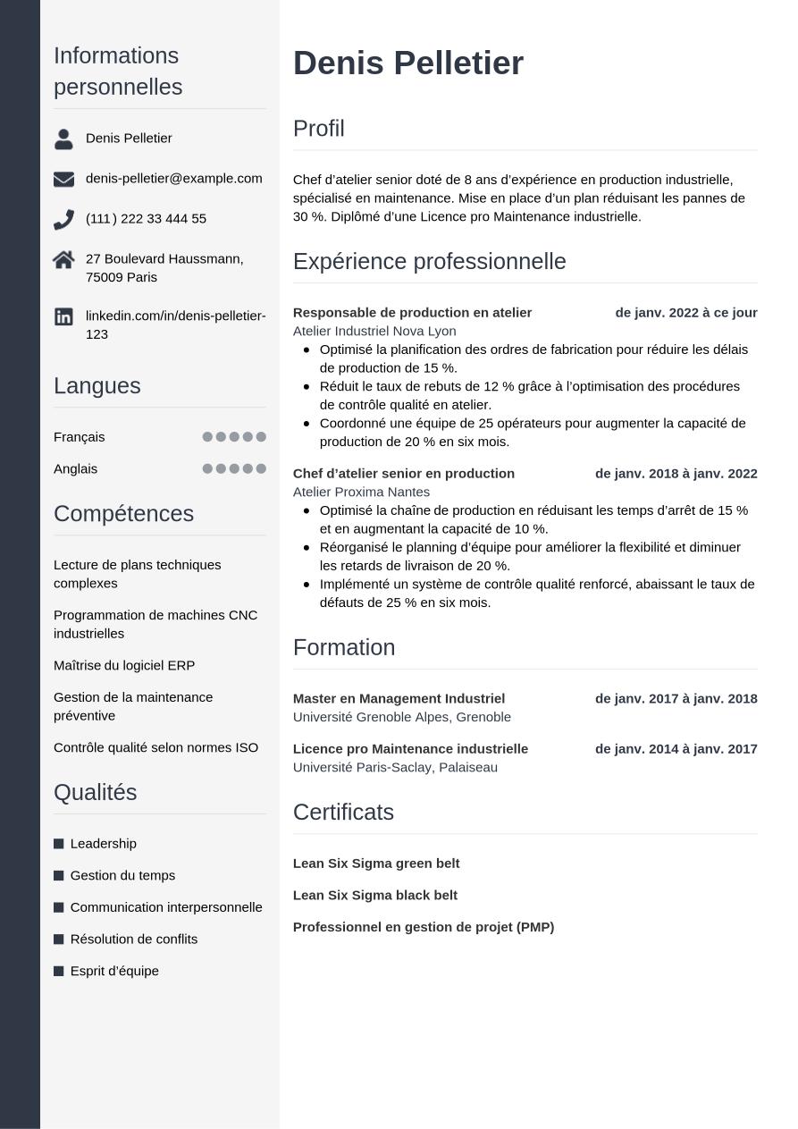 Maintenant que vous savez comment créer un CV de chef d’atelier réussi, observez le résultat d'un design actuel et élégant avec notre exemple ci-dessous :