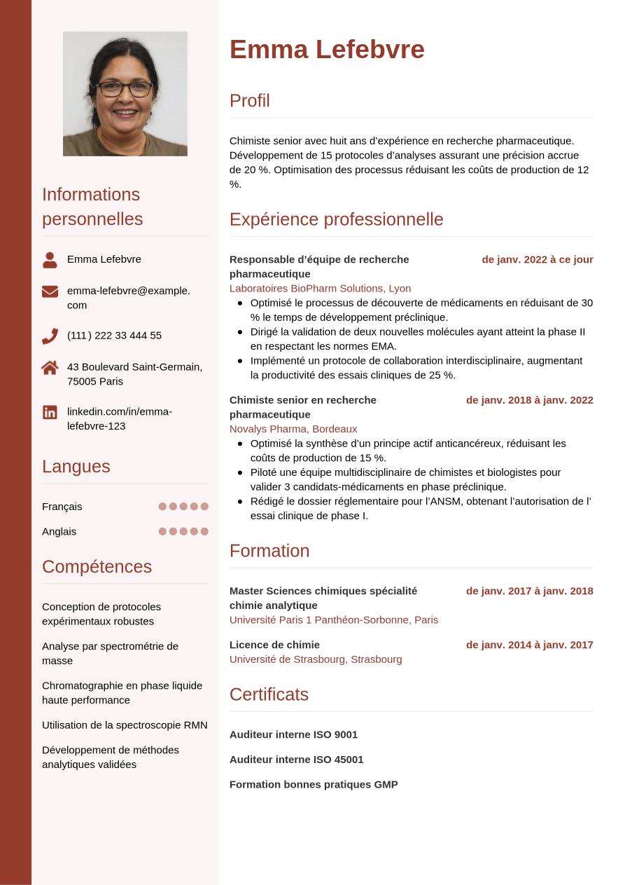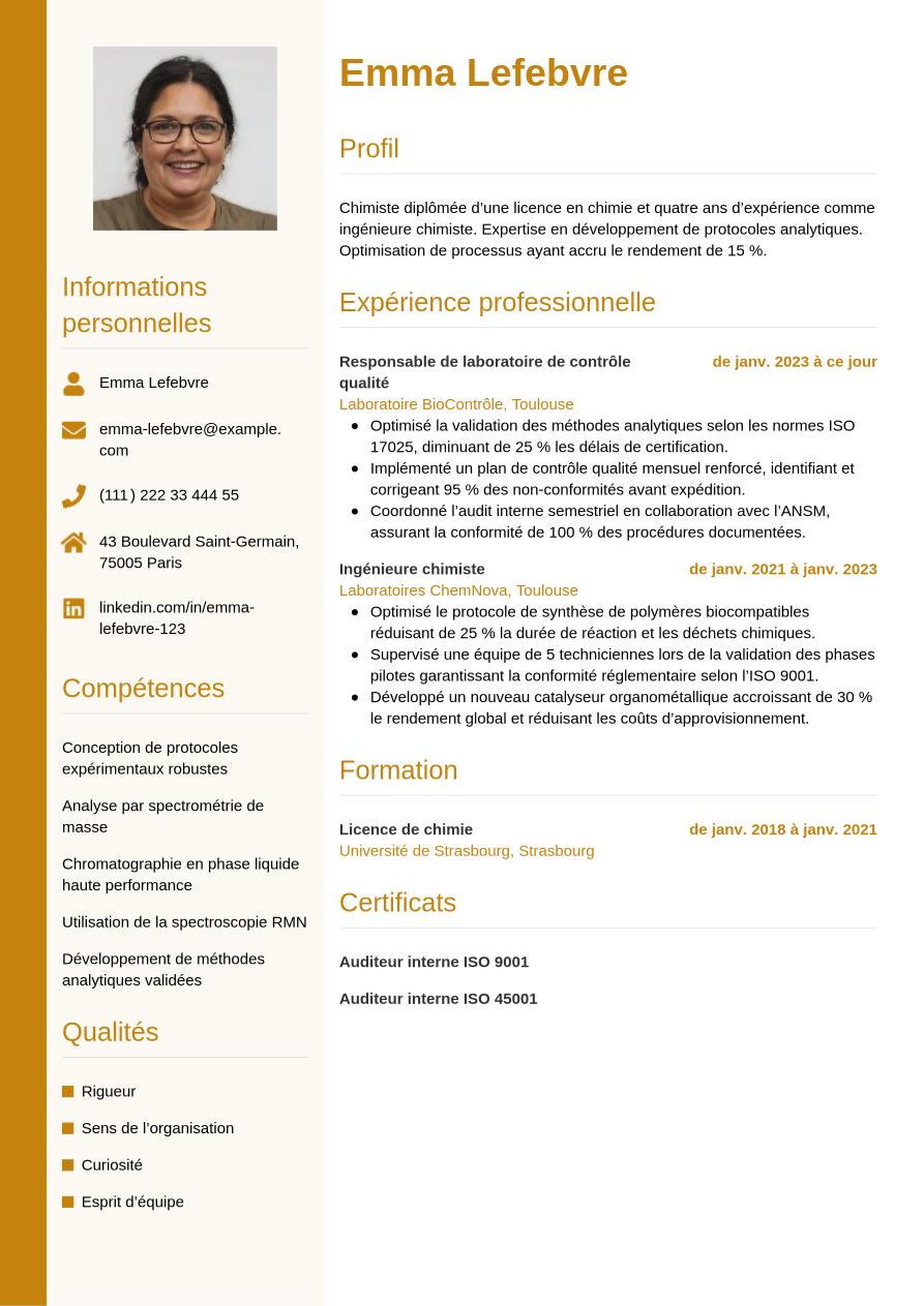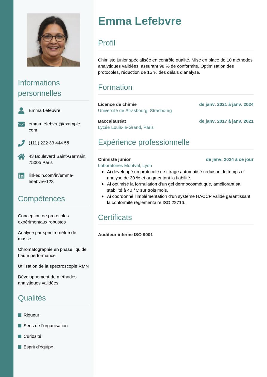 Un chimiste au profil débutant ou junior optera pour une structure chronologique positionnant formation et compétences en tête, suivies des expériences et éventuels stages.