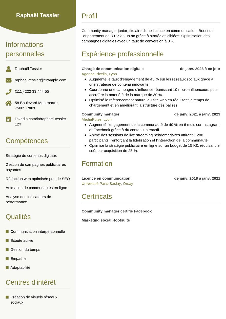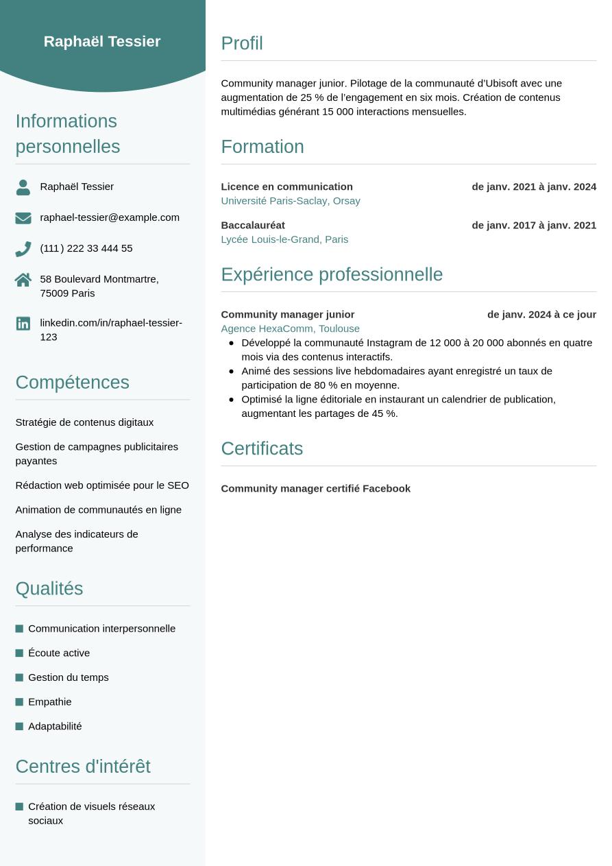 Maintenant que vous savez quels éléments constituent un CV de community manager, découvrez le résultat avec la mise en page moderne et professionnelle de notre exemple ci-dessous :