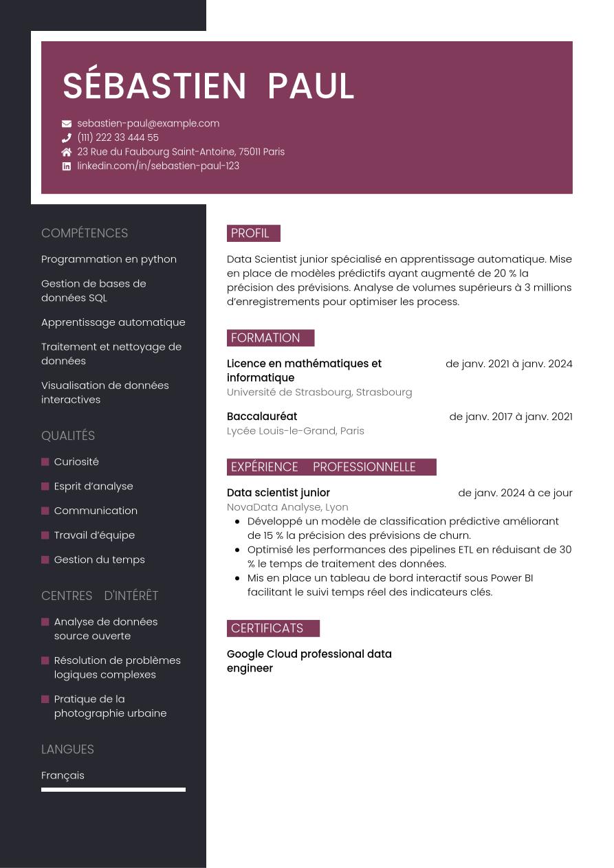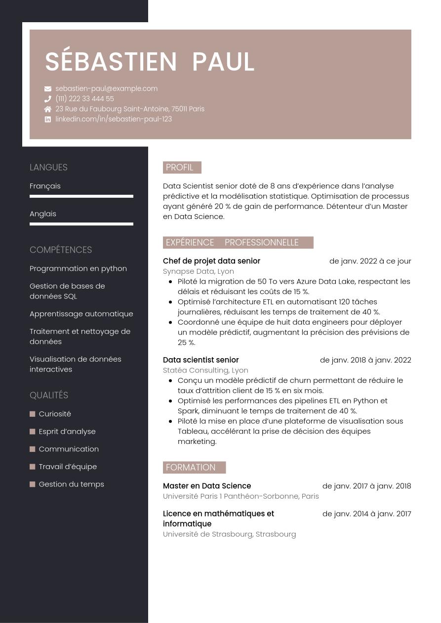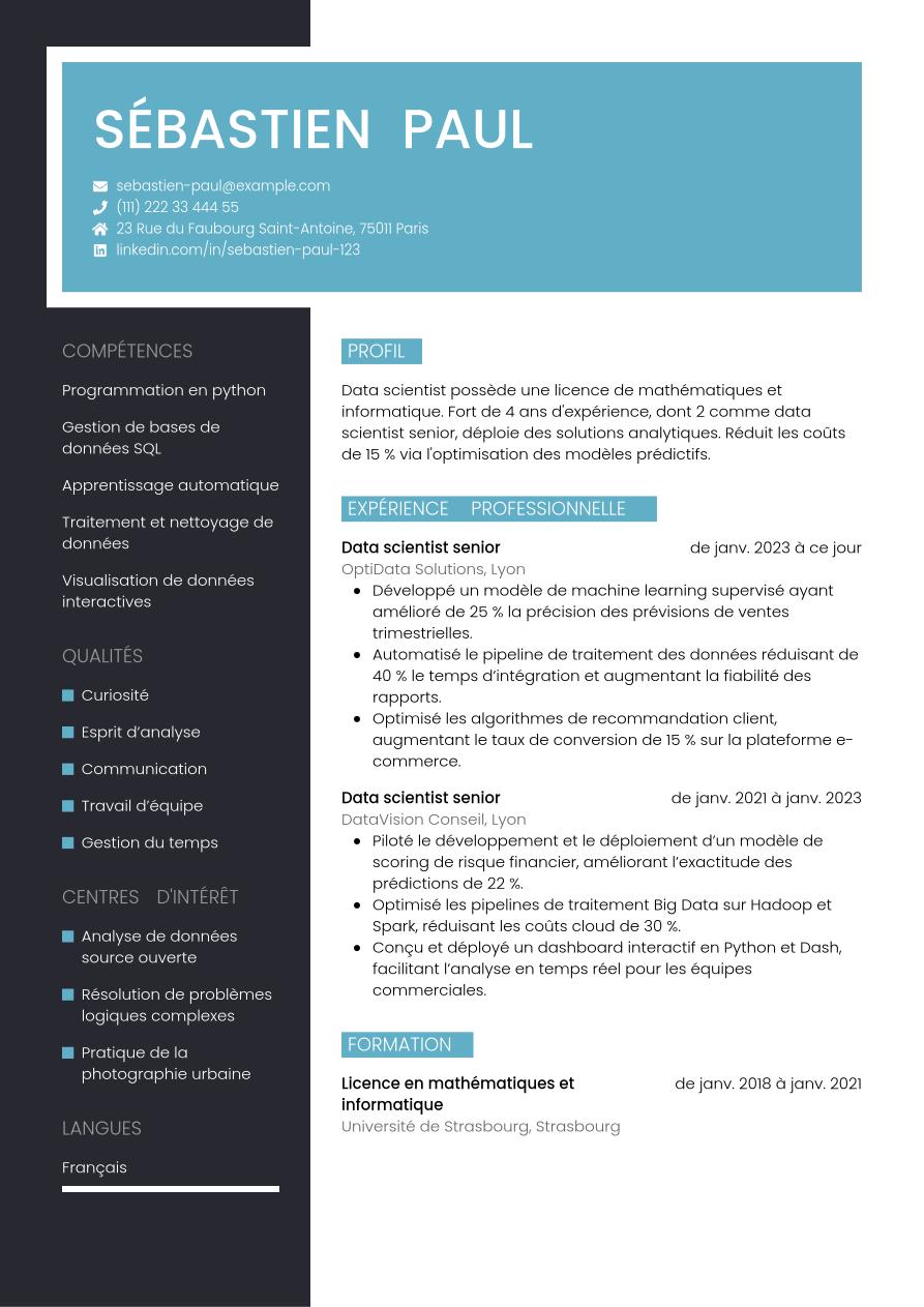 Vous savez à présent quelles sont les composantes clés d'un bon CV de data scientist. Voyez le résultat d'une présentation esthétique et contemporaine avec notre exemple :
