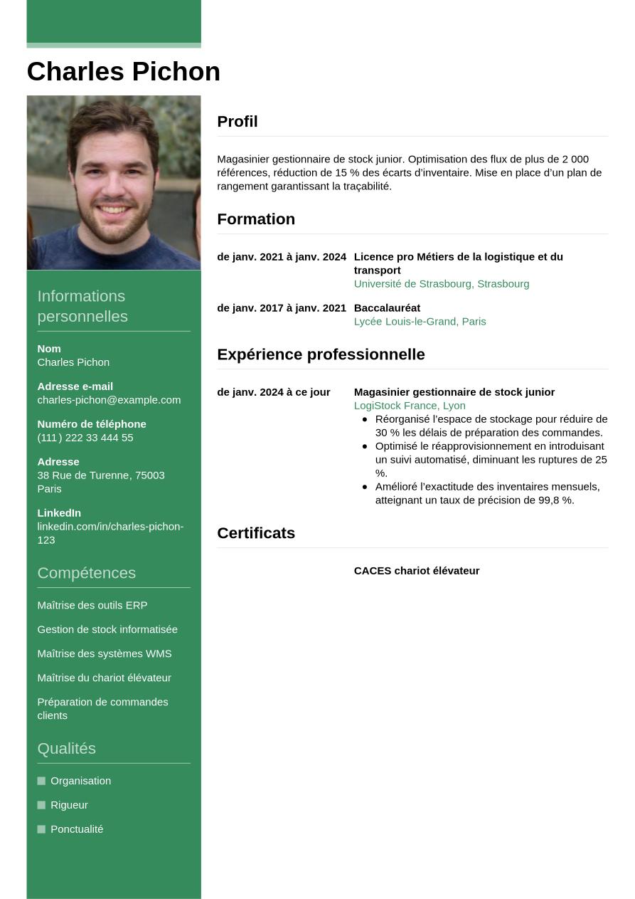 Maintenant que vous savez quels éléments constituent un CV de magasinier gestionnaire de stock, découvrez le résultat avec la mise en page moderne et professionnelle de notre exemple ci-dessous :