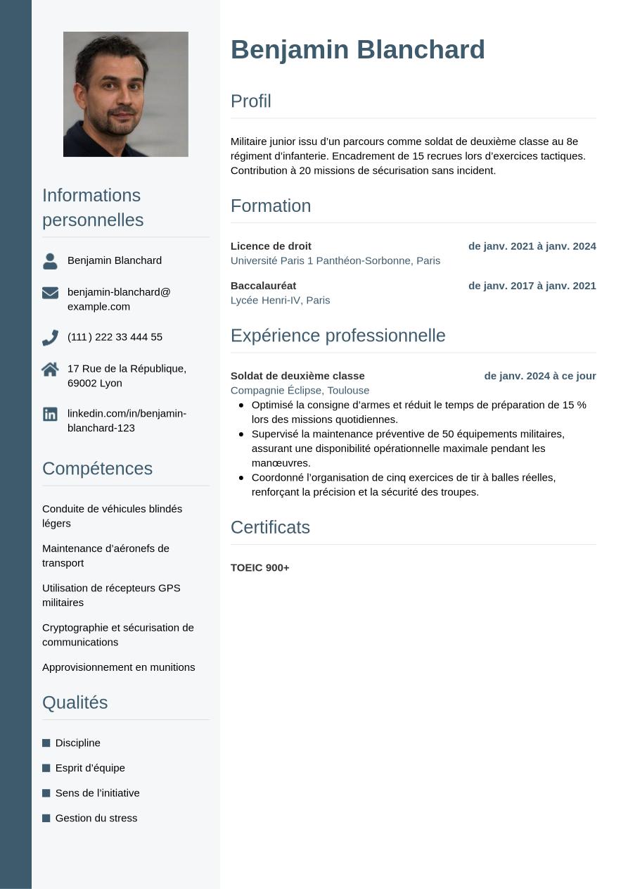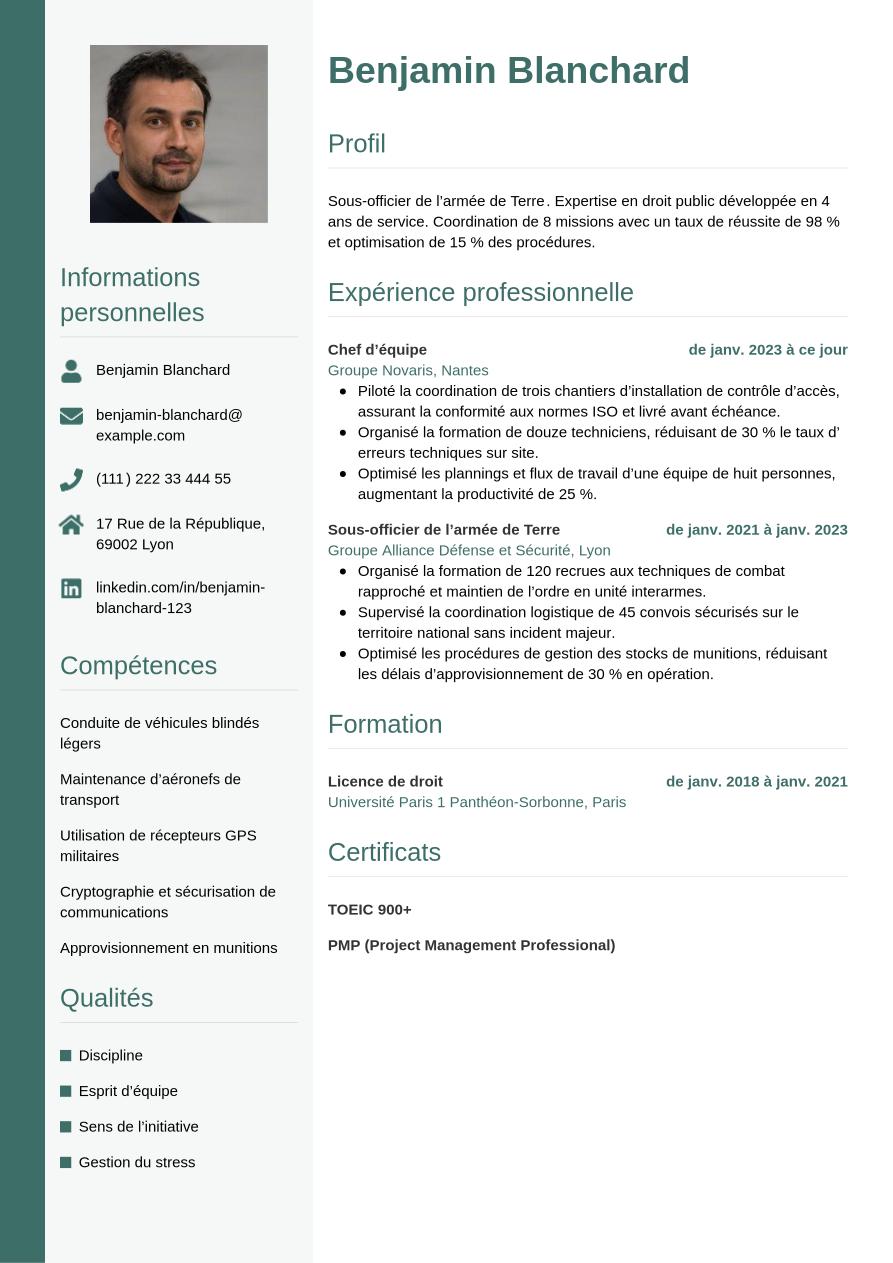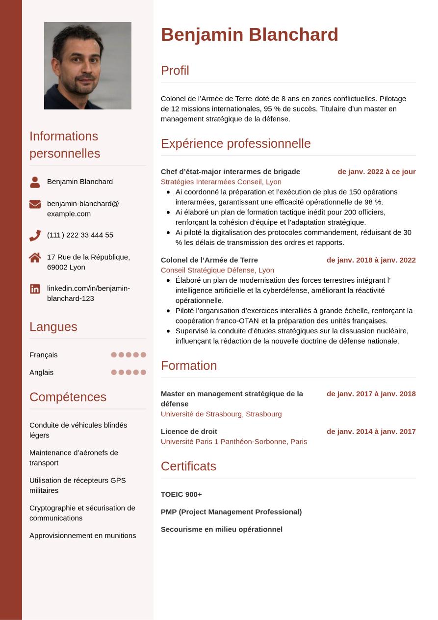 Après avoir vu comment créer un CV de militaire de qualité, découvrez le résultat final avec la mise en page moderne et professionnelle de notre exemple :