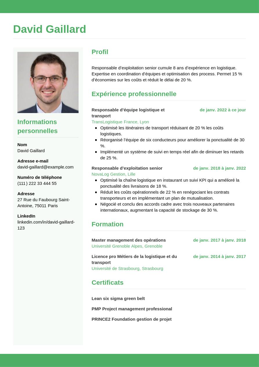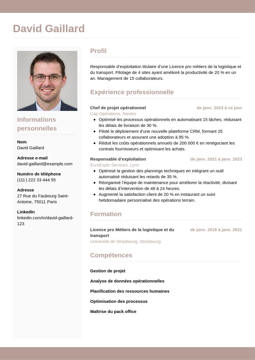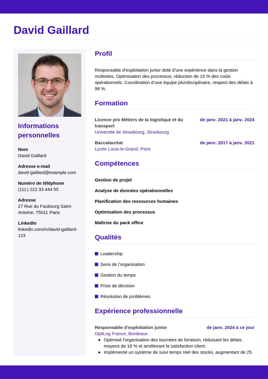 Vous savez à présent quelles sont les composantes clés d'un bon CV de responsable d’exploitation. Voyez le résultat d'une présentation esthétique et contemporaine avec notre exemple :