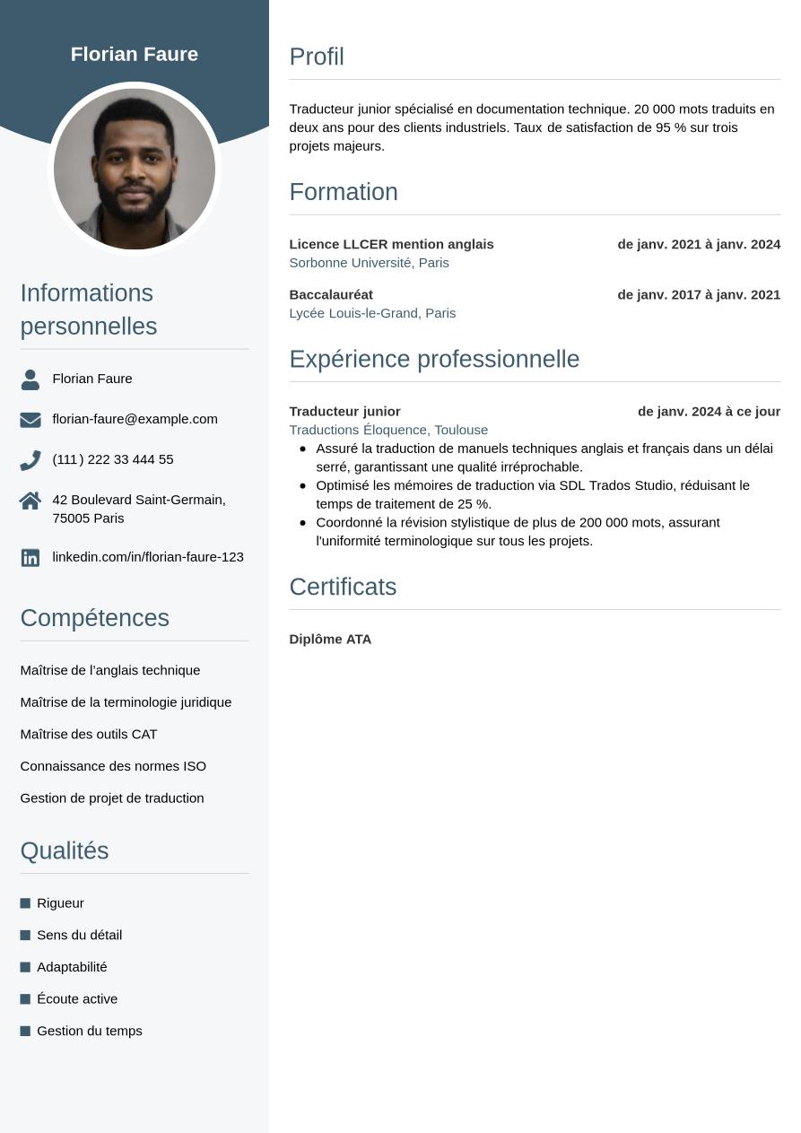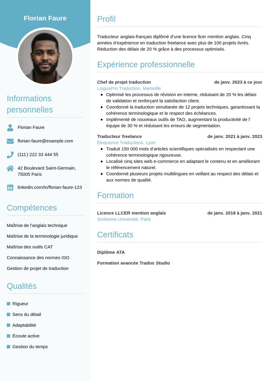 Maintenant que vous savez comment créer un CV de traducteur réussi, observez le résultat d'un design actuel et élégant avec notre exemple ci-dessous :