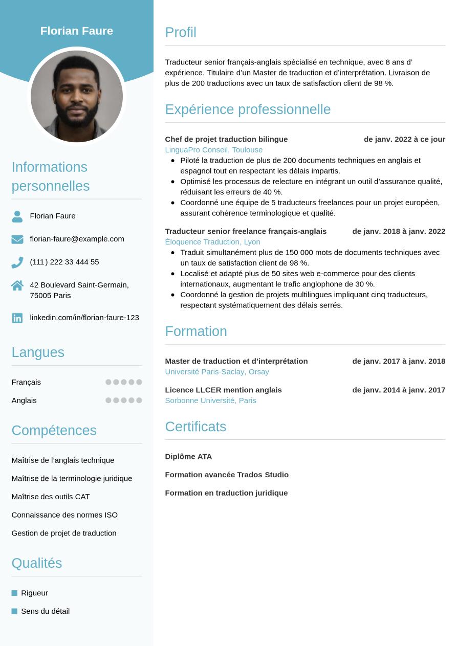Pour un candidat expérimenté, le CV de traducteur est à appréhender sous un angle différent. Le but n'est pas de répertorier les contrats successifs, mais de valoriser les enjeux de chaque poste, les projets pilotés, ainsi que les résultats et succès marquants faisant partie de son parcours.