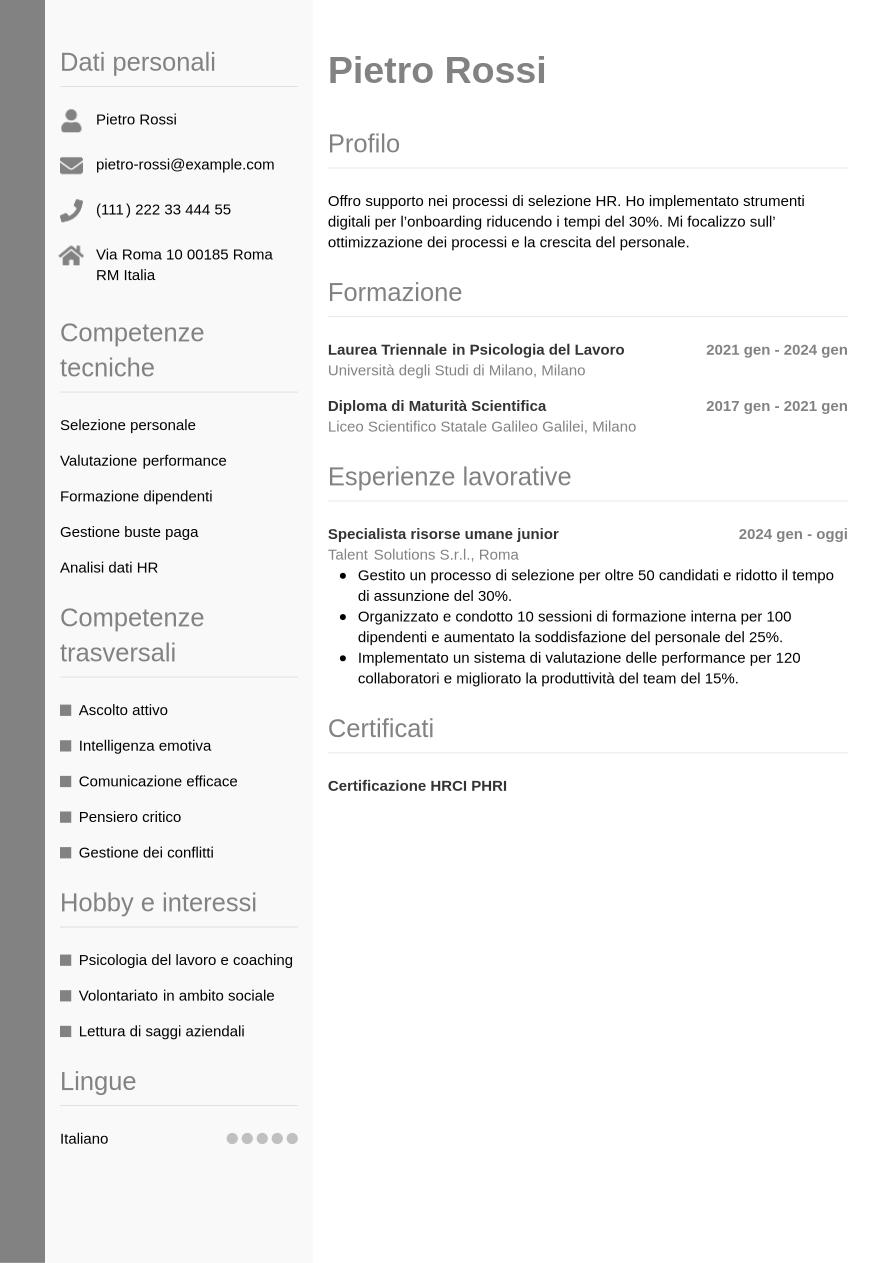Hai poche esperienze lavorative perché hai concluso da poco la scuola superiore o l'università? Allora il tuo curriculum da risorse umane darà spazio soprattutto, nell'ordine, alla formazione, alle competenze e alle esperienze di stage, volontariato e hobby - purché funzionali al ruolo che ti interessa. Se la sezione di esperienze professionali è poco 'guarnita', non è il caso di preoccuparsi: in un curriculum da risorse umane per posizioni junior, i recruiter si aspettano di trovare altro, come appunto dettagli sul percorso formativo, skill idonee, esperienze di altro tipo.