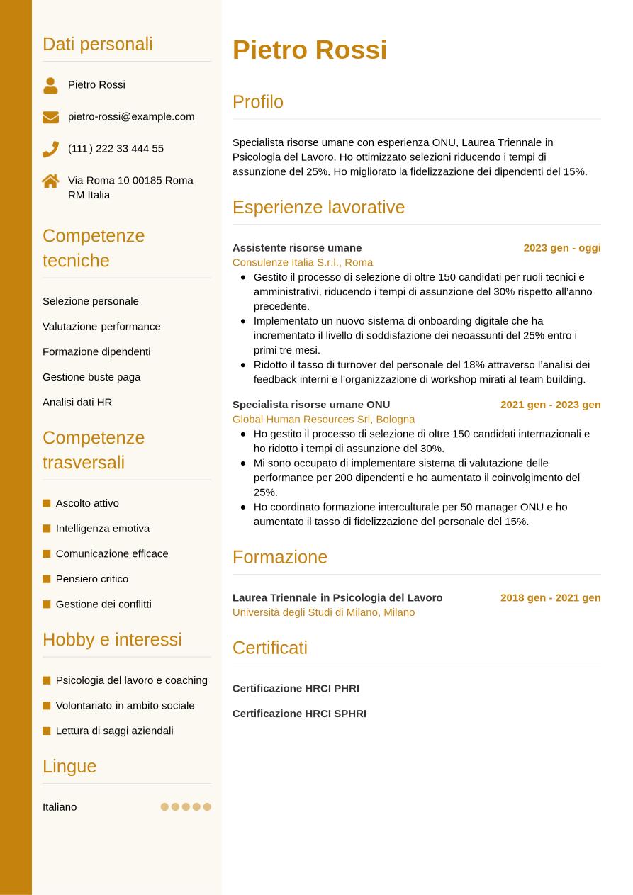 Specialista risorse umane con esperienza ONU, Laurea Triennale in Psicologia del Lavoro. Ho ottimizzato selezioni riducendo i tempi di assunzione del 25%. Ho migliorato la fidelizzazione dei dipendenti del 15%.