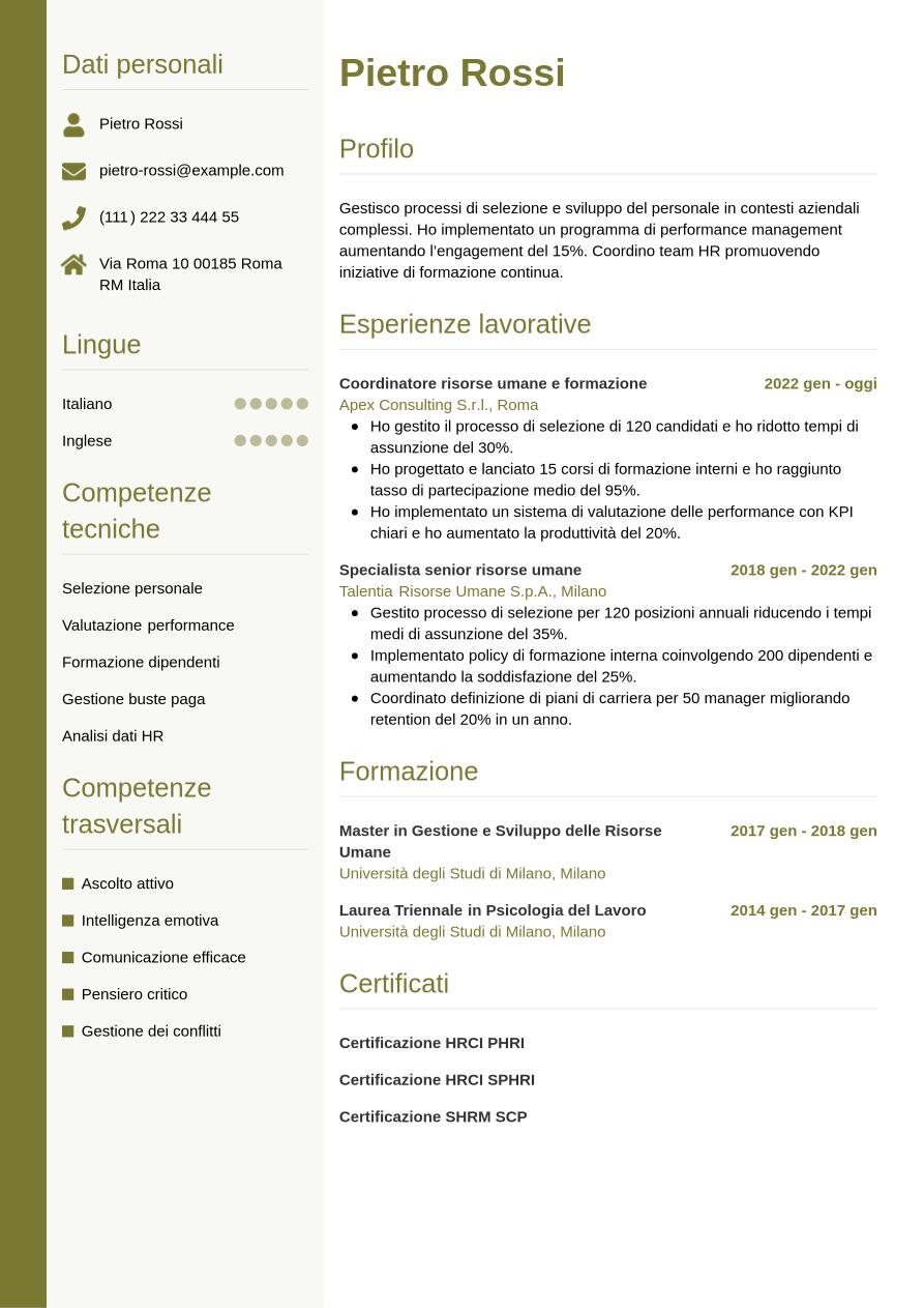 Sezioni ben definite, punti elenco, keyword pertinenti, layout pulito, in grado di orientare chi legge in modo fluido e coerente: questi sono gli ingredienti principali di un curriculum da risorse umane efficace. Il secondo must di un CV che lascia il segno sono contenuti mirati e concreti. Usa soltanto le informazioni rilevanti per la posizione che ti interessa e completa le descrizioni di mansioni svolte e obiettivi raggiunti con dati quantitativi o esempi pratici.