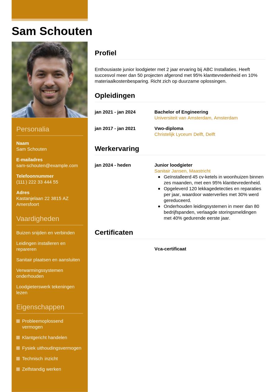 Heb je nog weinig werkervaring om te delen op je loodgieter cv? Leg dan de nadruk op je opleidingen en vaardigheden. Een functioneel cv is een goede keuze: je zet je studie, vaardigheden en cursussen bovenaan je cv , gevolgd door je werkervaring. Om je profiel verder te versterken, kun je ook vrijwilligerswerk of stages opnemen. Zeker in het begin van je carrière laten zulke ervaringen goed zien welke kwaliteiten je in huis hebt, ook buiten een betaalde functie om.