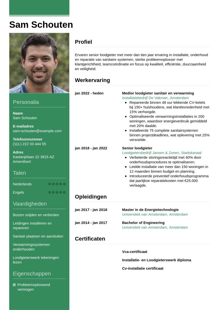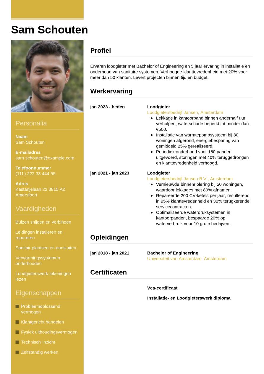 Alle losse secties zijn besproken. Nu laten we zien hoe je die samenbrengt tot één samenhangend en professioneel cv. Bekijk hieronder een goed loodgieter cv dat alles op één pagina samenvat.
