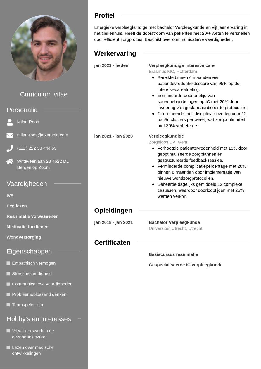 Een overtuigend verpleegkundige cv is toegespitst op de functie-eisen en laat duidelijk zien welke ervaring en vaardigheden jij meebrengt. Laat met krachtige actiewoorden en meetbare prestaties zien wat jij als verpleegkundige hebt bereikt. Daarmee maak je direct duidelijk wat jouw waarde is voor een toekomstige werkgever.