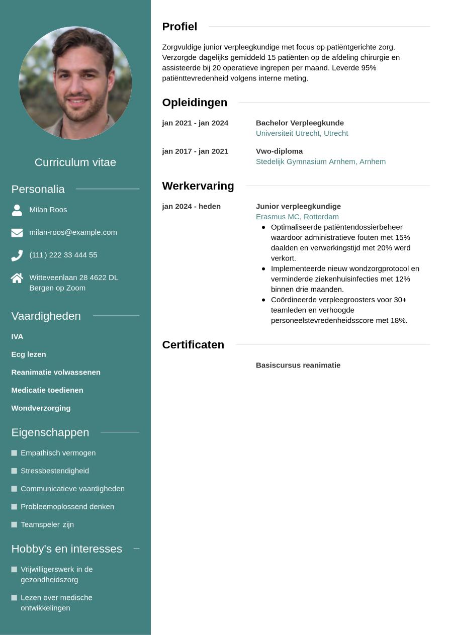 De personalia staan bovenaan je cv en zijn het eerste wat recruiters zien. Zet hier je volledige naam en een functietitel die aansluit bij jouw profiel en de vacature. Vermijd vage of te algemene titels, maar kies voor een concrete en relevante titel. Zo vergroot je kans op een uitnodiging. Onder je naam en functietitel is er ruimte voor je contactgegevens. De contactgegevens die je deelt op je verpleegkundige cv zijn je e-mailadres, telefoonnummer en locatie. Voor je locatie is je woonplaats doorgaans voldoende, maar het is niet ongebruikelijk om je volledige adres te delen. Daarnaast is het een goed idee om je LinkedIn-profiel op je cv te zetten. Zorg er natuurlijk wel voor dat je profiel up-to-date is.