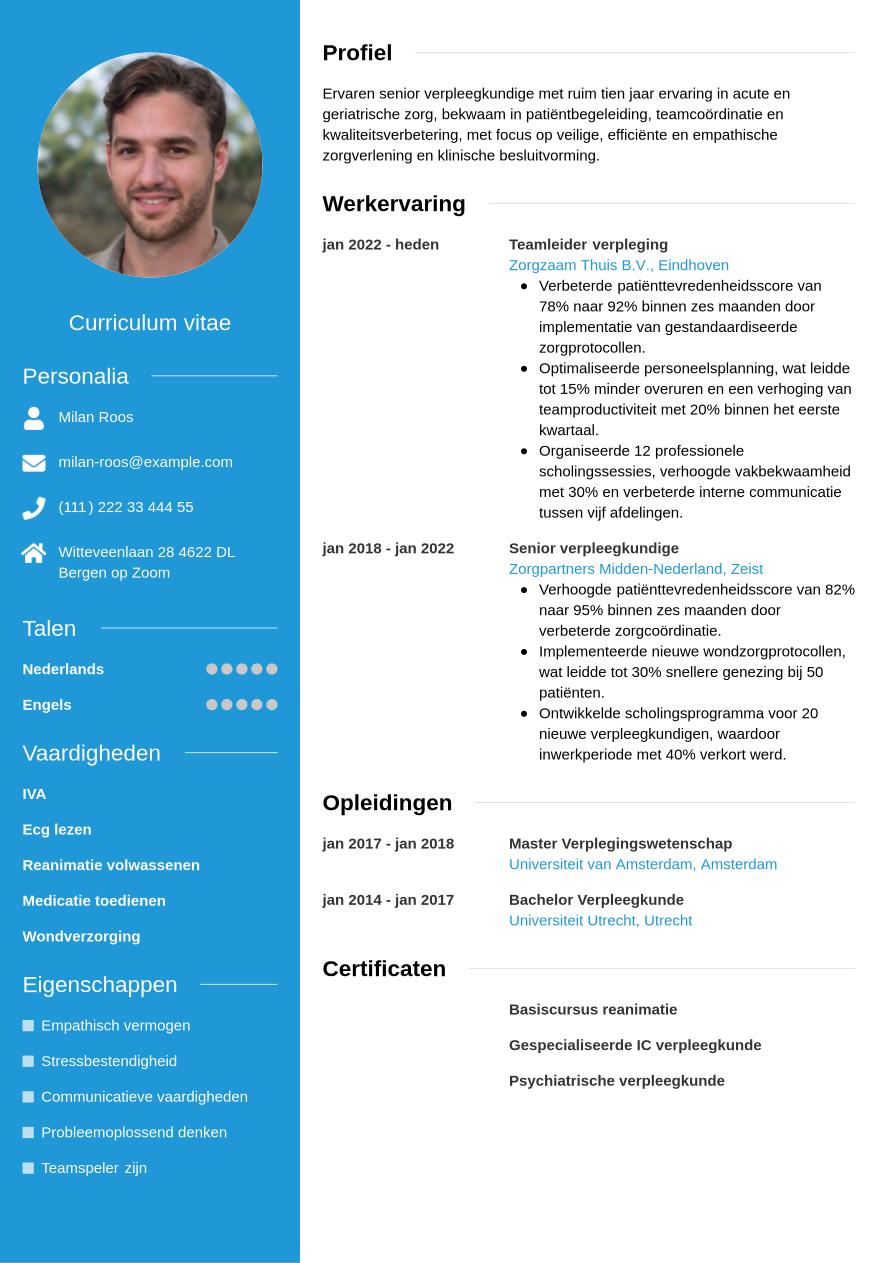 Als ervaren verpleegkundige presenteer je je werkervaring in omgekeerd-chronologische volgorde. Je cv laat op een heldere manier zien welke ervaring, prestaties en vaardigheden jij hebt opgebouwd. Met meer ervaring mag je cv langer zijn dan gemiddeld. Dat geeft je ruimte om ook aanvullende secties toe te voegen, zoals publicaties, projecten en behaalde erkenningen.