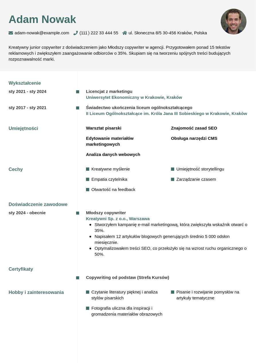 Tworząc CV copywritera jako początkujący specjalista, musisz pogodzić się z tym, że doświadczenie zawodowe nie będzie jeszcze robić wrażenia. To nie jest jednak powód do rezygnacji, bynajmniej! Oznacza to po prostu, że musisz wysilić nieco więcej kreatywnych muskułów. CV juniora to idealne miejsce na wykorzystanie innych atutów: edukacji, aktywności pozauczelnianej, certyfikatów, wolontariatu czy projektów własnych. Dzięki takim dodatkom pokażesz rekruterowi, że masz zapał i potencjał, a to często znaczy więcej niż sam staż pracy na stanowisku copywritera.
