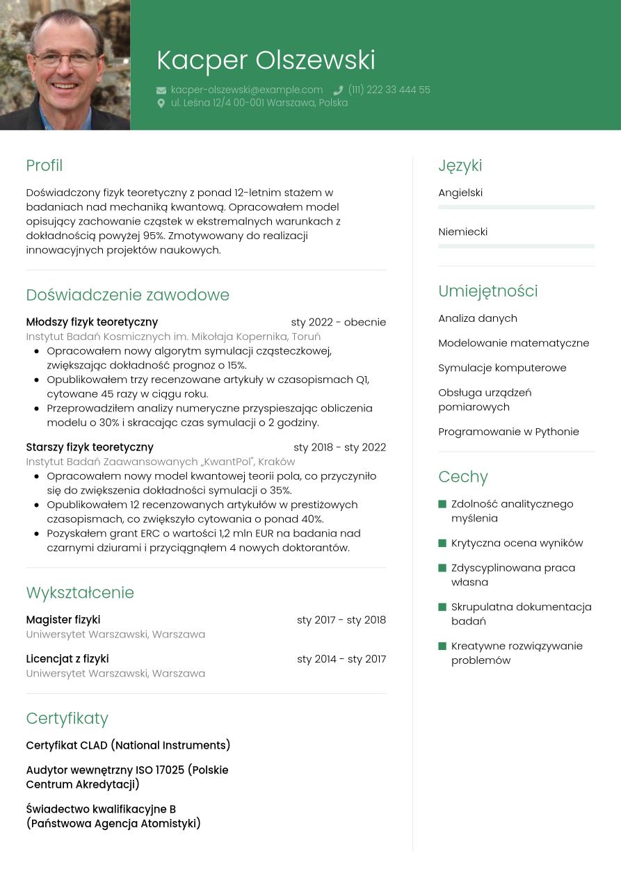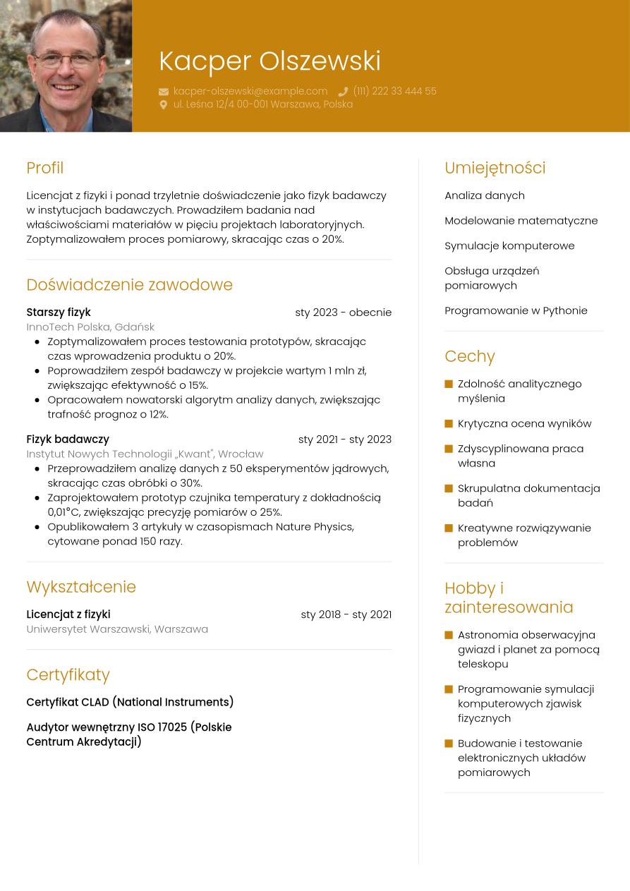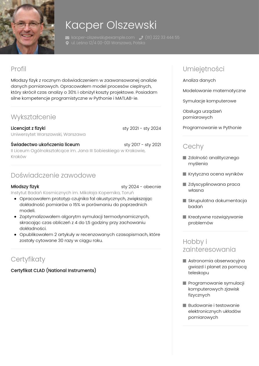 Masz już komplet informacji o tym, co powinno zawierać dobre CV fizyka, zatem pora sprawdzić przykład gotowego dokumentu.