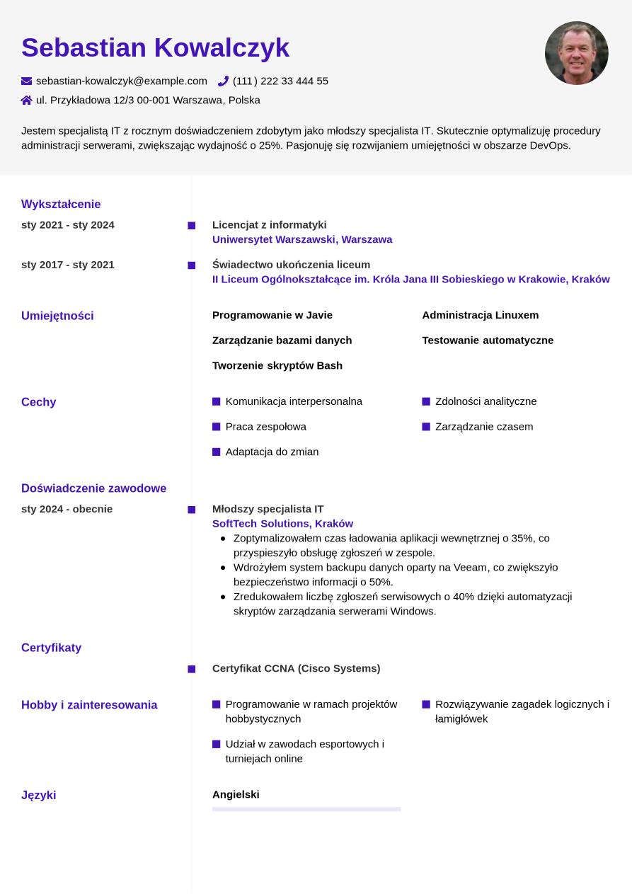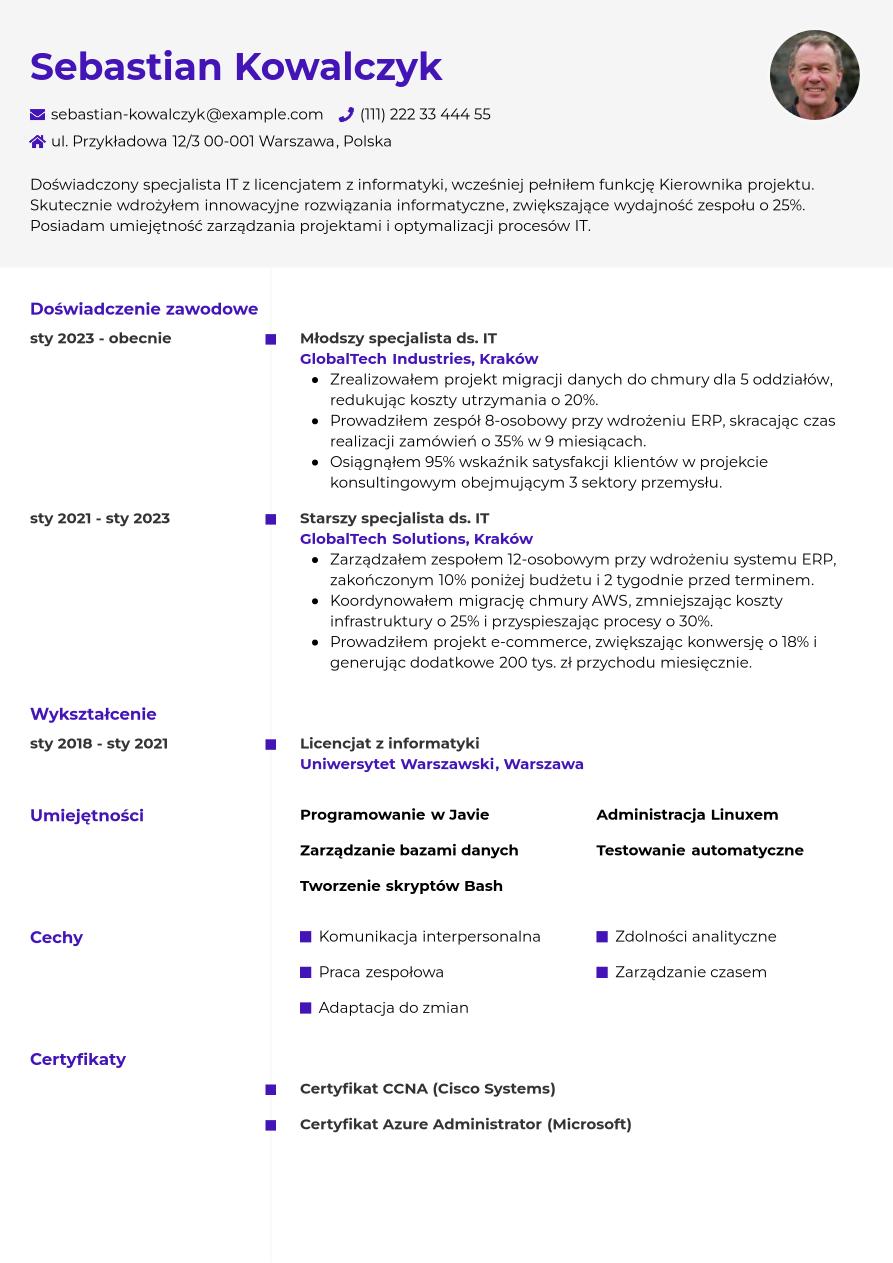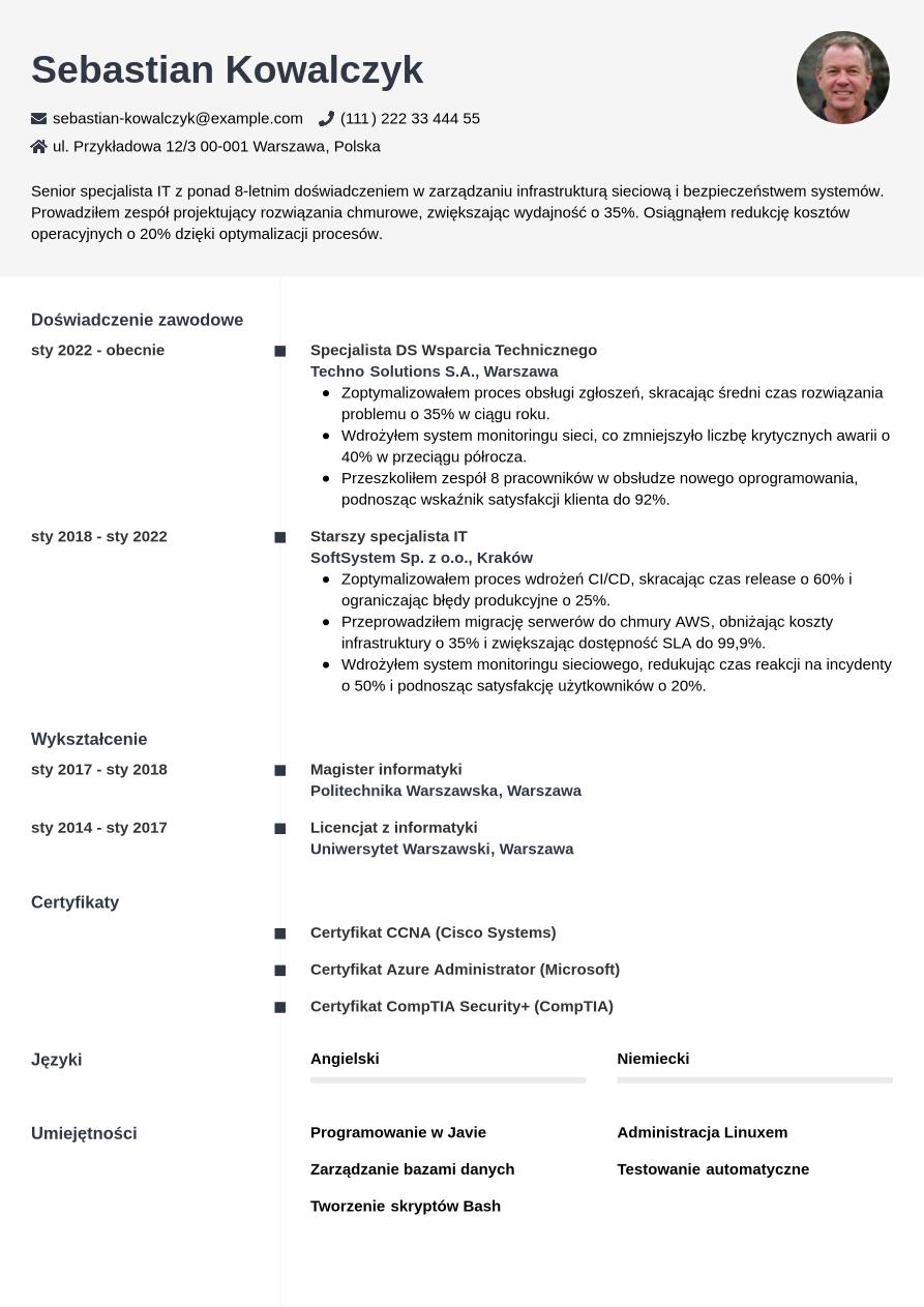 Jako osoba z kilkuletnim doświadczeniem w roli specjalisty it, jesteś już poza etapem uczenia się na błędach. Twój dorobek zawodowy powinien mówić sam za siebie, pod warunkiem, że potrafisz go dobrze przedstawić. Twoje CV nie może być przypadkowym zestawieniem informacji – musi działać jak profesjonalna prezentacja Twojego profilu. Każdy element dokumentu powinien być przemyślany i maksymalnie dopasowany do wymagań pracodawcy. Skup się na mierzalnych efektach swojej pracy, domkniętych projektach oraz obowiązkach jakie na Tobie spoczywały, choćby takich jak wsparcie techniczne użytkowników. Twój profil powinien wybrzmiewać dojrzale, jak świadoma prezentacja kompetencji specjalisty gotowego na kolejne kroki zawodowe.