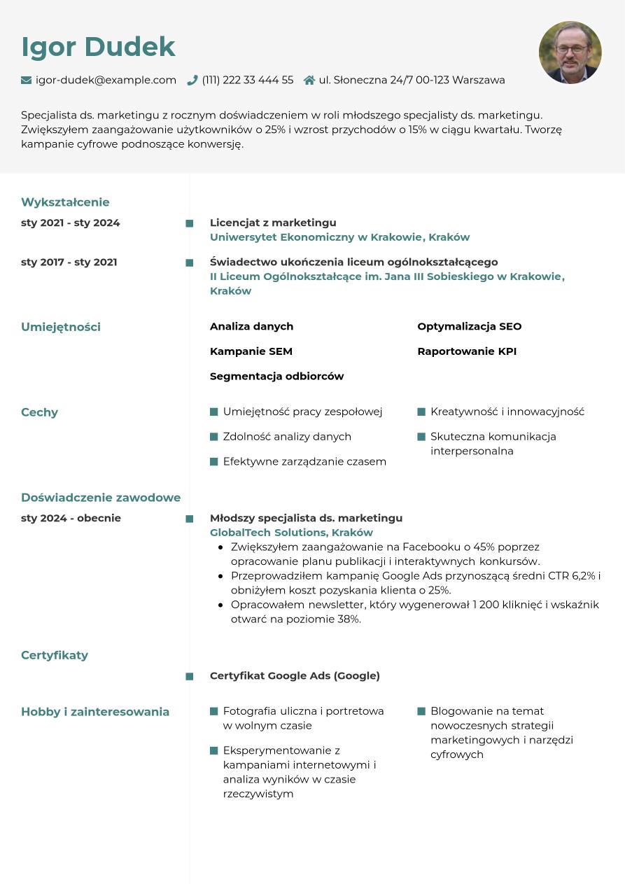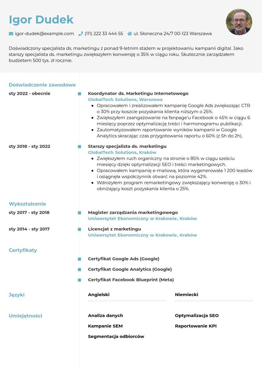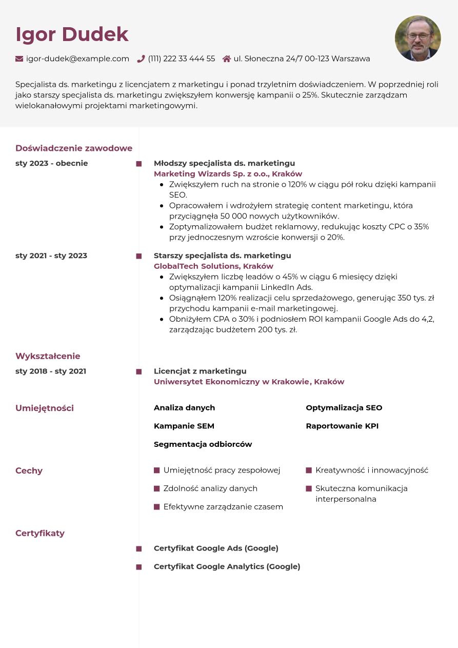 Omówiliśmy już wszystkie kluczowe sekcje, które powinny znaleźć się w Twoim CV specjalisty ds. marketingu. Teraz zobacz, jak może wyglądać całość w praktyce.