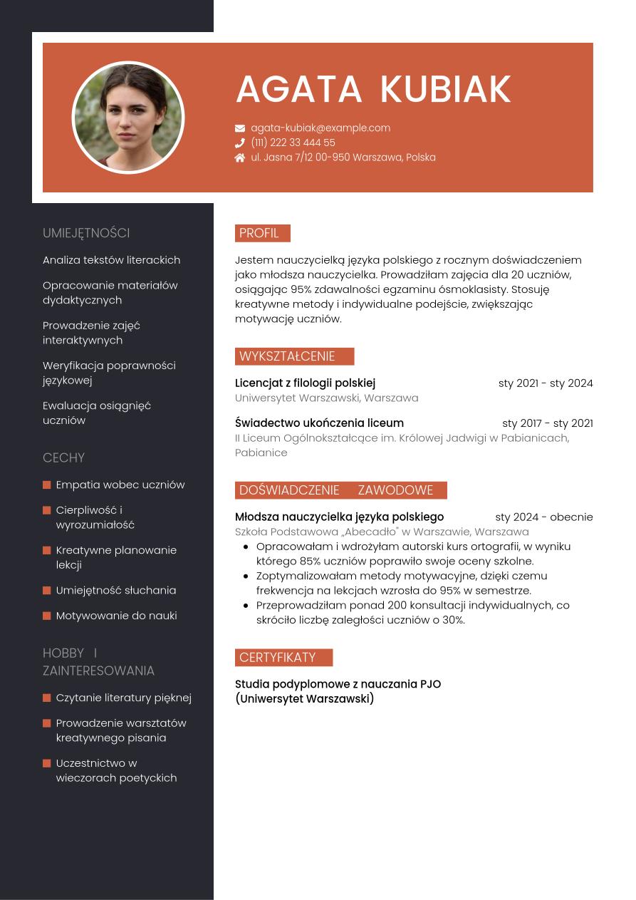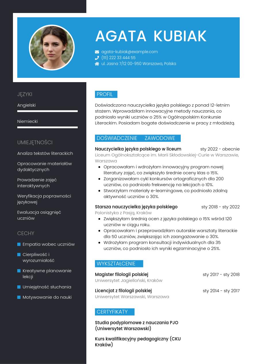 Masz już komplet informacji o tym, co powinno zawierać dobre CV nauczyciela języka polskiego, zatem pora sprawdzić przykład gotowego dokumentu.